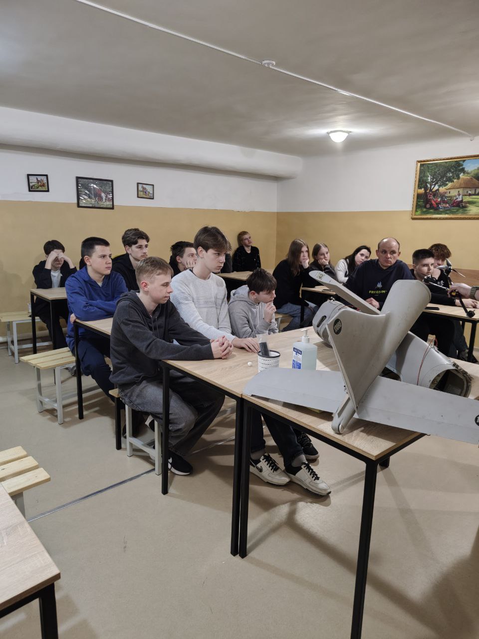 Військові принесли з собою унікальні експонати – зразки БпЛА російських окупаційних військ, які були збиті над територією Запорізької області. Здобувачі освіти ознайомилися з технічними характеристиками безпілотників і дізналися, як саме українські воїни їх знешкоджують.