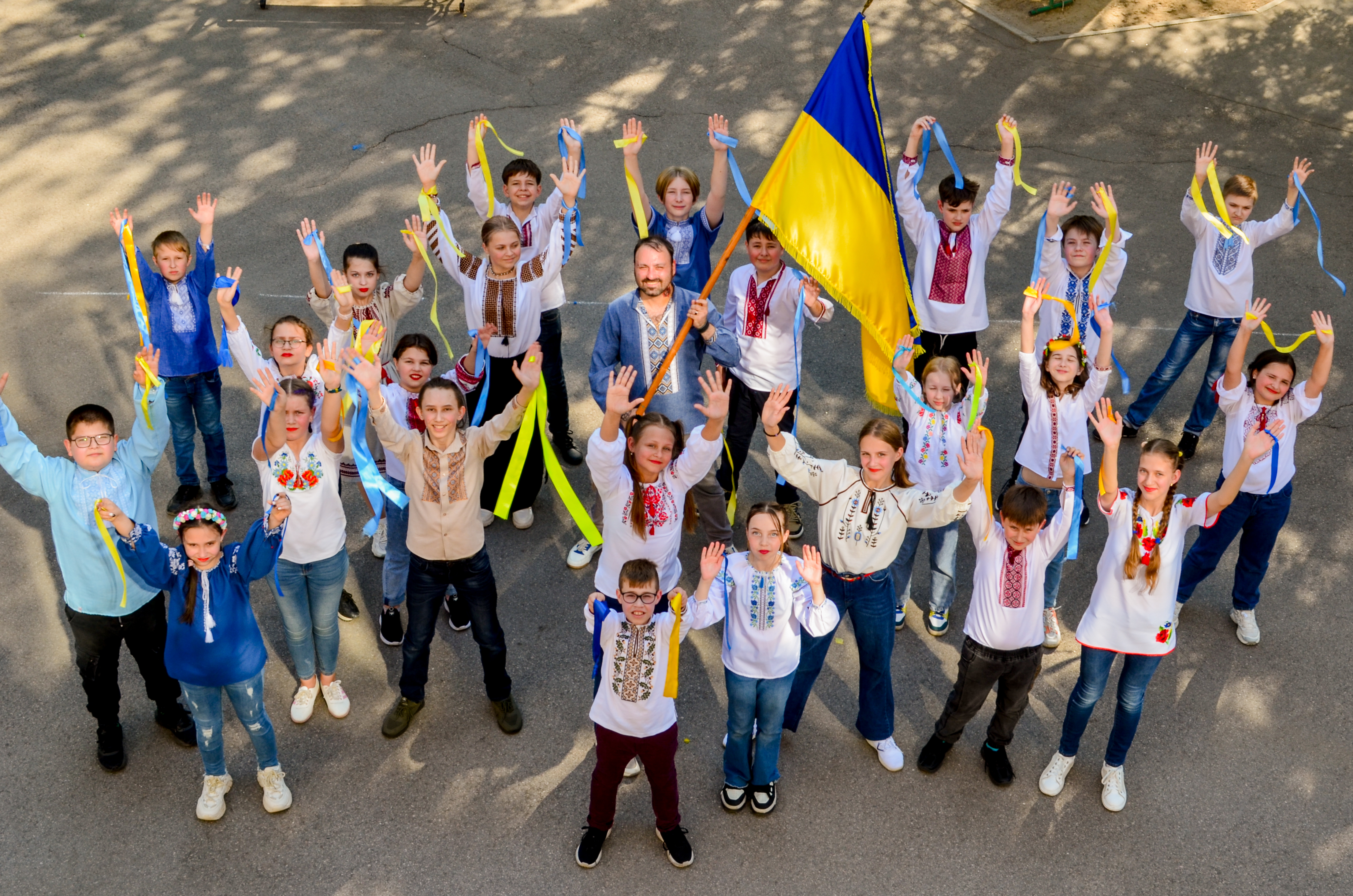На подвір'ї закладу освіти зібралися учні в яскравому національному вбранні.