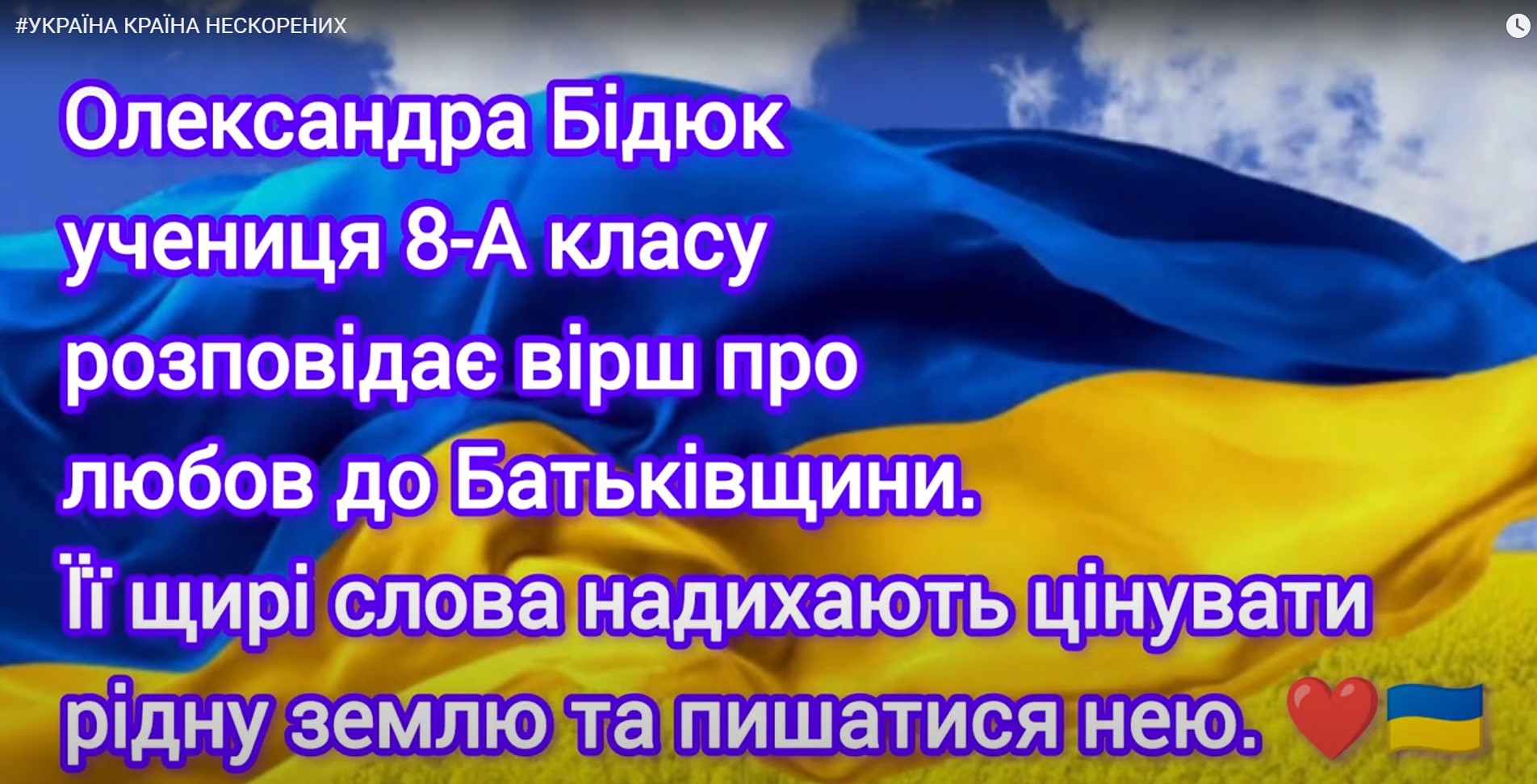 Олександра Бідюк, учениця 8-А класу Козацького ліцею долучилася до поетичного відеочеленжу "Україна- країна нескорених"