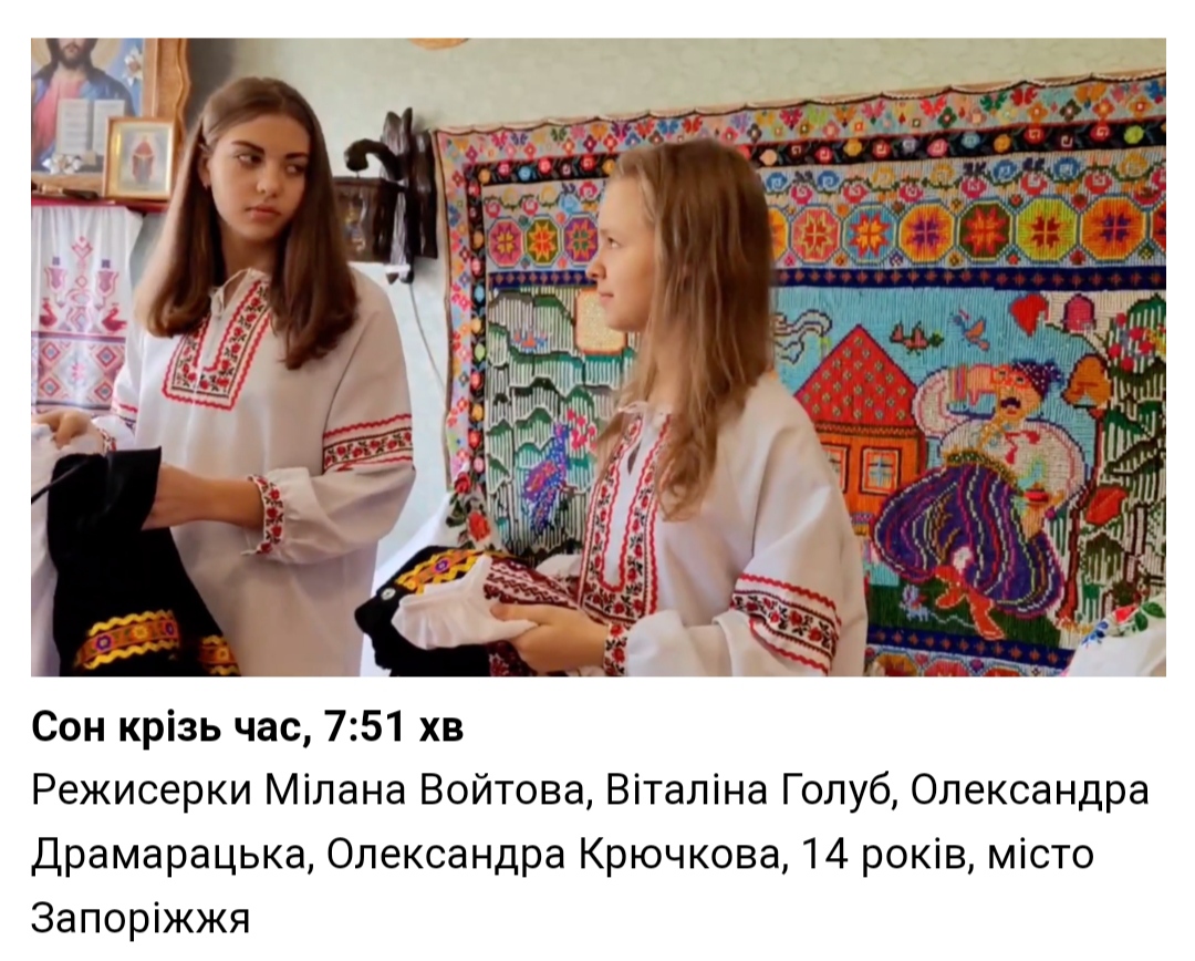З-поміж майже сотні короткометражних фільмів у фінал цьогорічного Дитячого кіноконкурсу пройшли лише 16 заявок від дітей із різних куточків України та тимчасових переселенців за кордоном. Серед фільмів-фіналістів – робота «Сон крізь час» юних режисерок-учениць Запорізької школи-інтернату «Козацький ліцей» Войтової Мілани, Голуб Віталіни, Драмарацької Олександри та Крючкової Олександри.