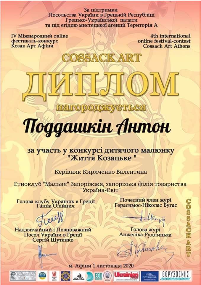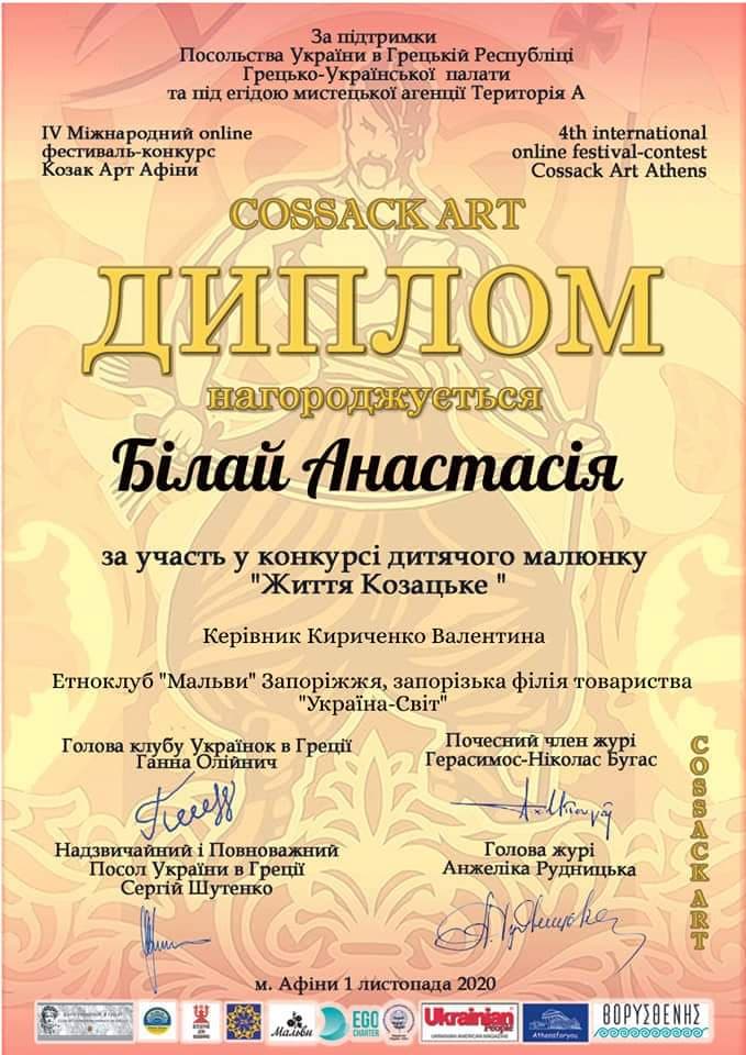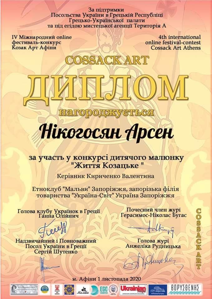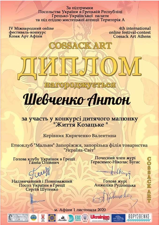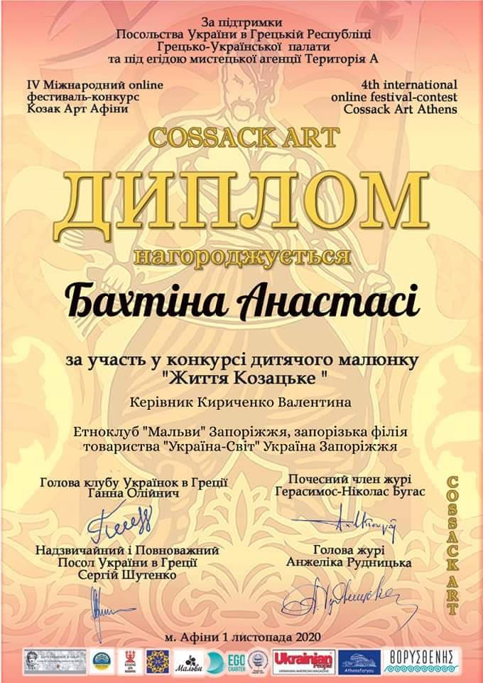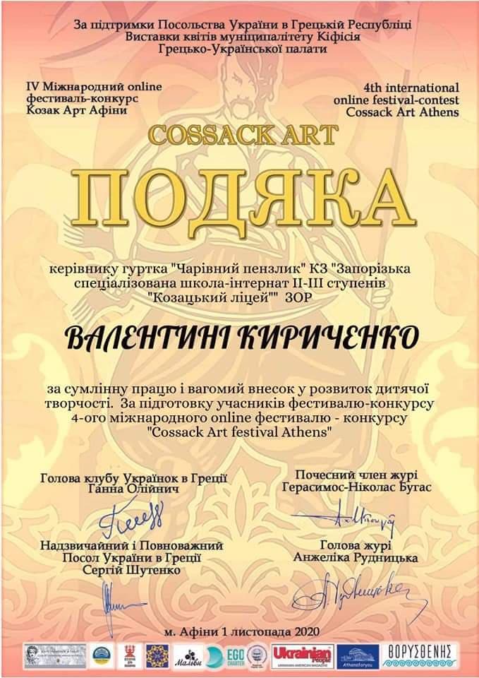 1 листопада 2020 року в м. Афіни (Греція) пройшов ІV Міжнародний online фестиваль – конкурс «Сossack art festival Athens - Козак Арт у Афінах».