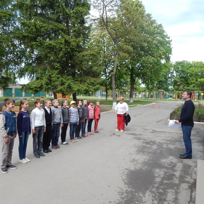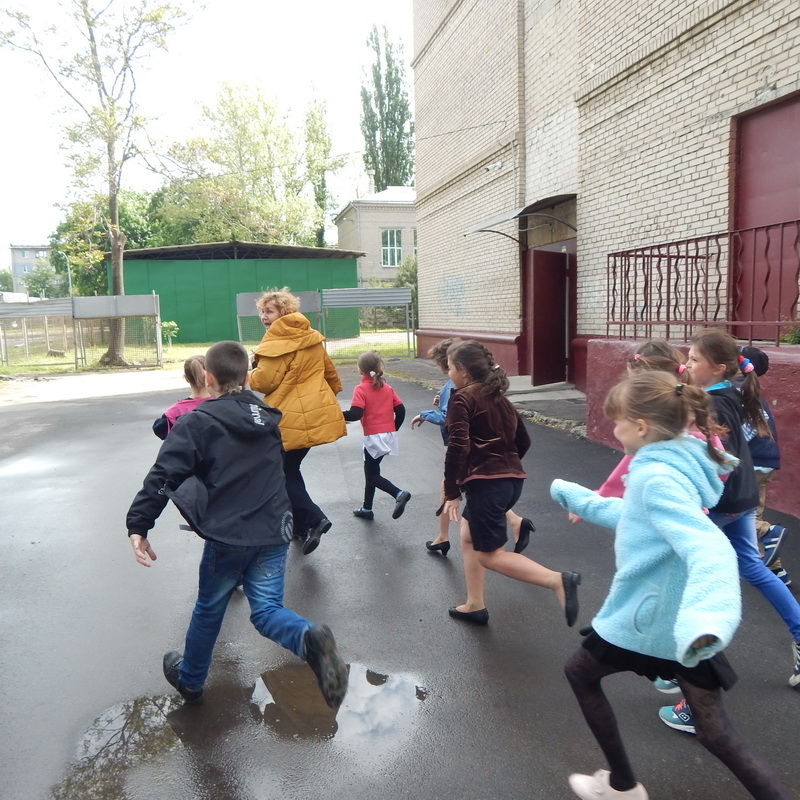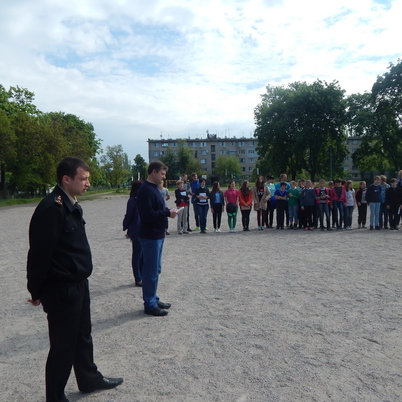 Спочатку за 4-ма дзвінками учні в супроводі вчителів здійснили навчальну евакуацію з приміщення ліцею. Вишикувавшись на спортивному майданчику, прозвітували про свою готовність до подальших дій.