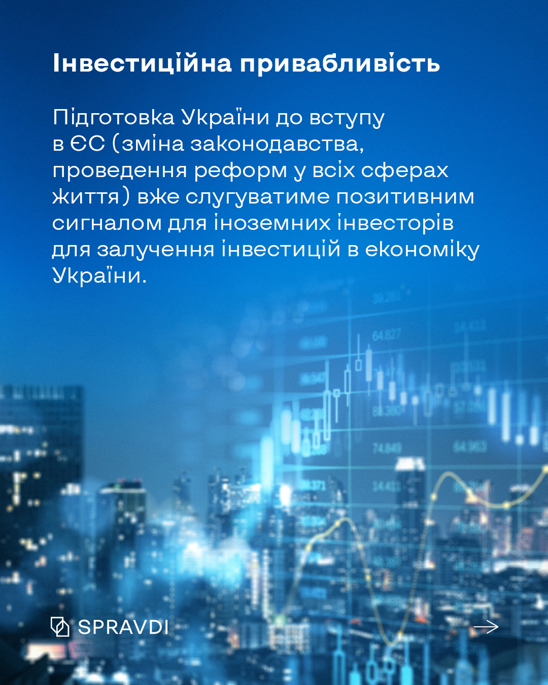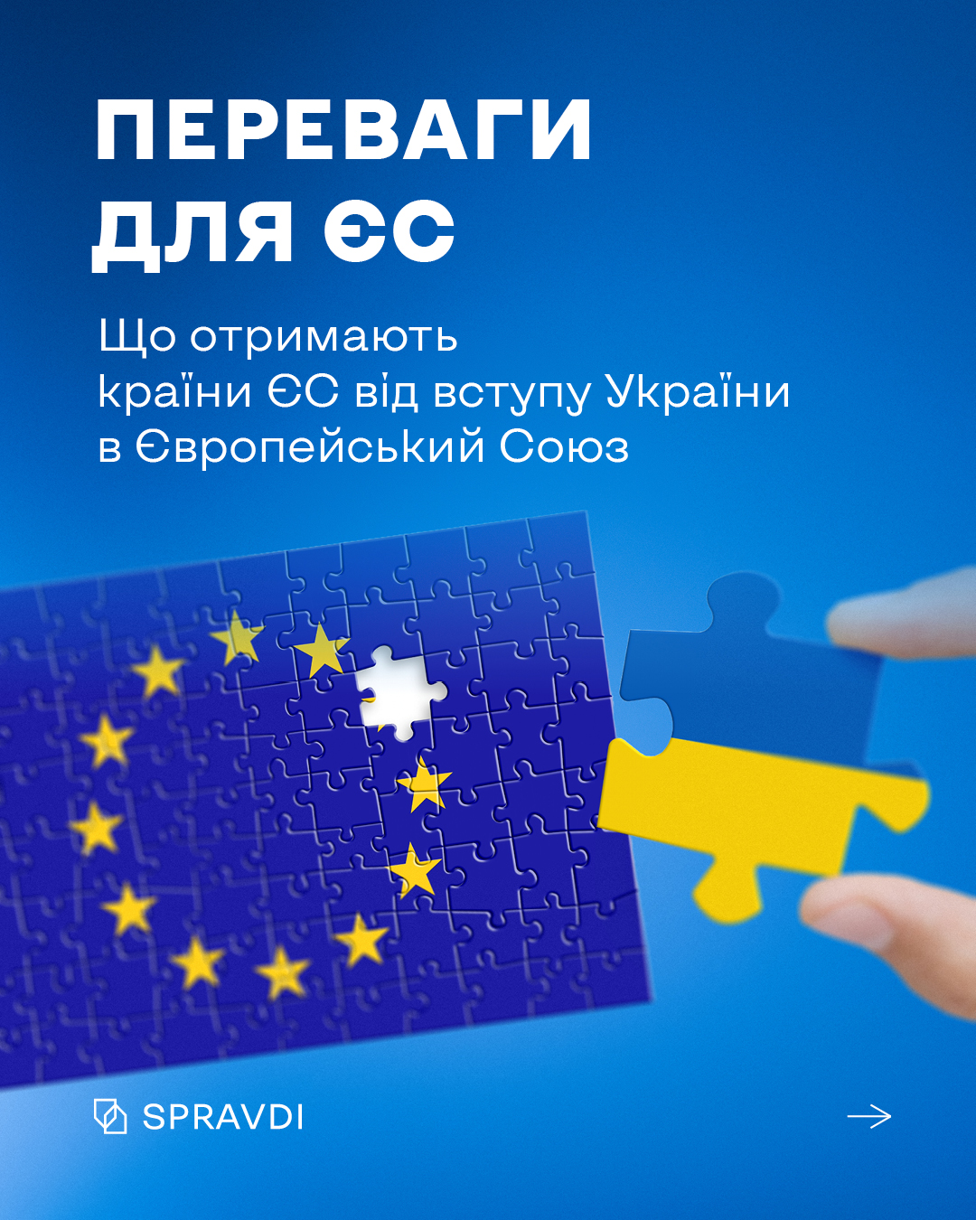 Завдяки Україні Євросоюз посилить свою геополітичну роль, зміцнить обороноздатність, отримає можливість цифровізувати державні послуги за українським досвідом та стане більш підготовленим до викликів сьогодення. Україна надасть новий поштовх для ще більшого розвитку Європейського Союзу.