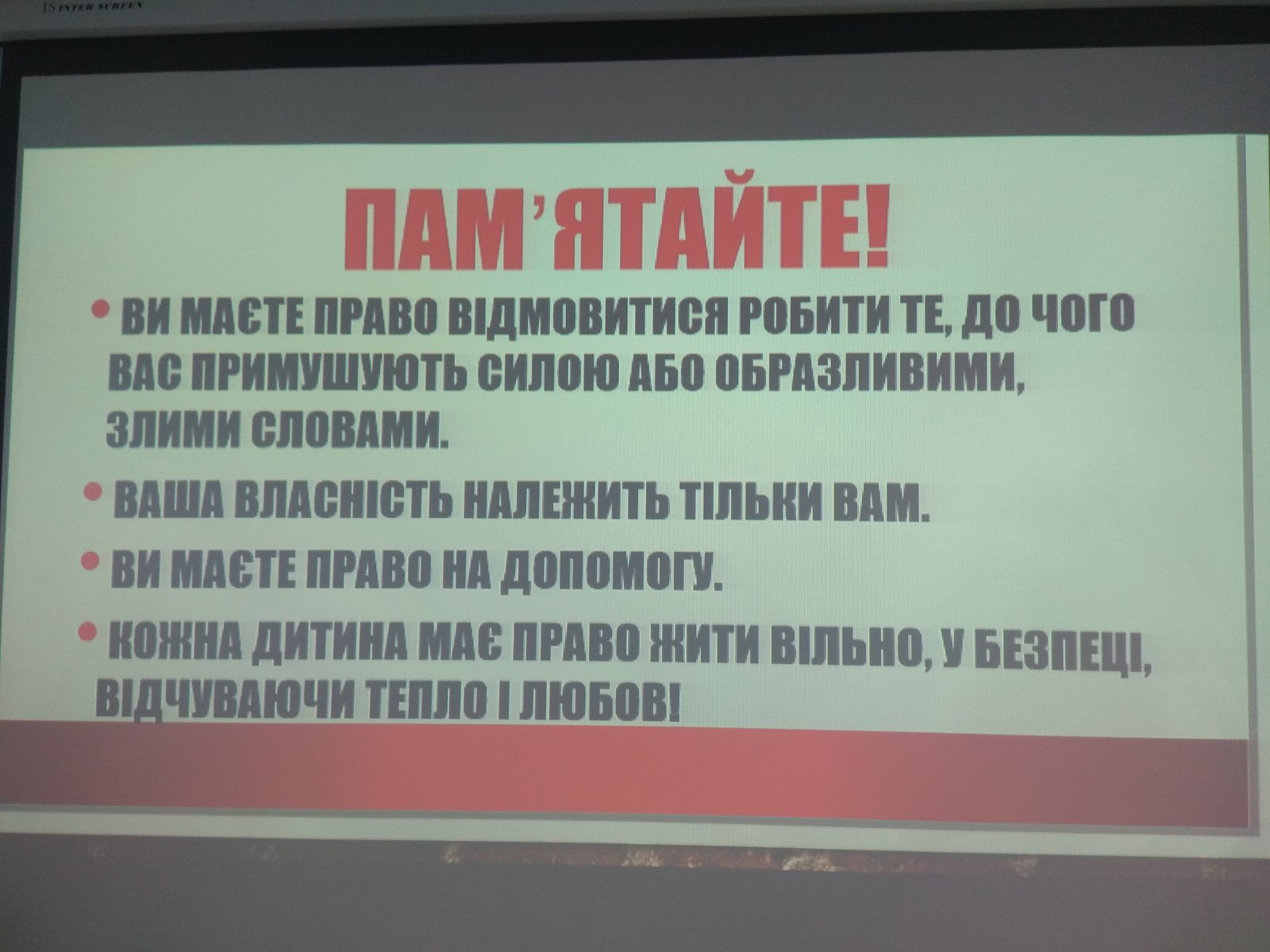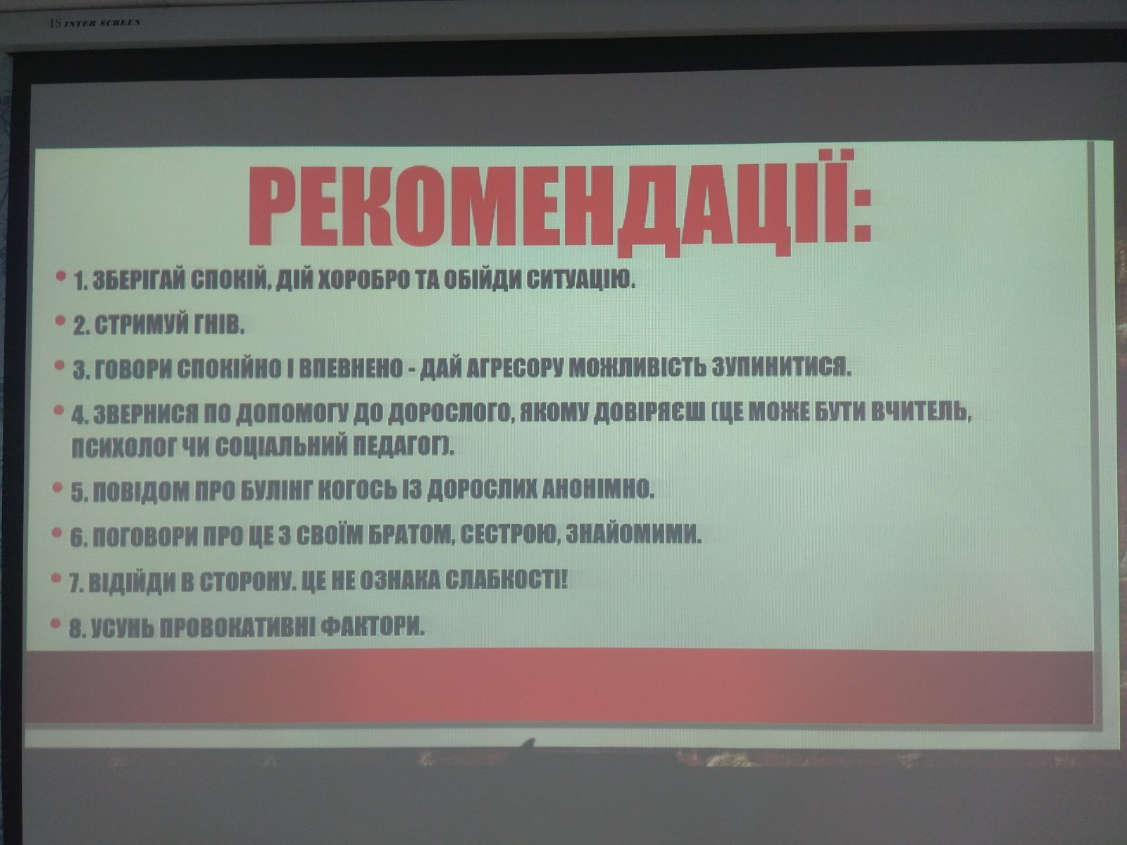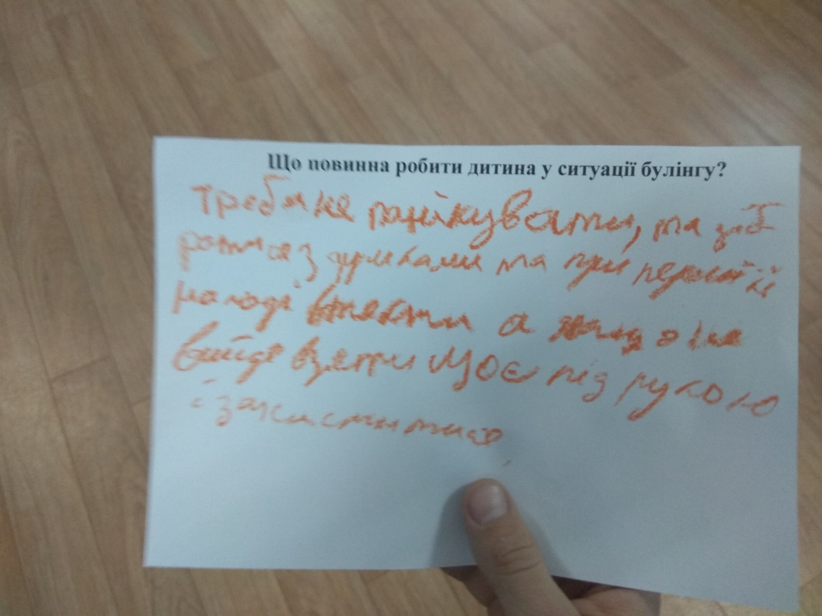 Під час заняття обговорити поняття «булінг», спробували зрозуміти почуття жертви булінгу та поведінку агресора, а найголовніше – разом знайшли шляхи допомоги постраждалому від булінгу та визначили, як убезпечити себе, щоб не зіграти одну з ролей у булінгу.