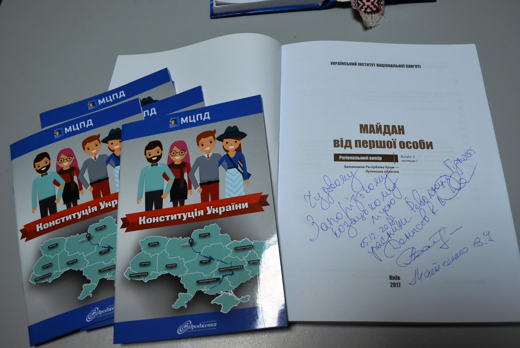 На завершення зустрічі гості подарували ліцеїстам збірник фрагментів спогадів учасників та очевидців протестних акцій «Майдан від першої особи» і «Конституцію України» в 7 примірниках.