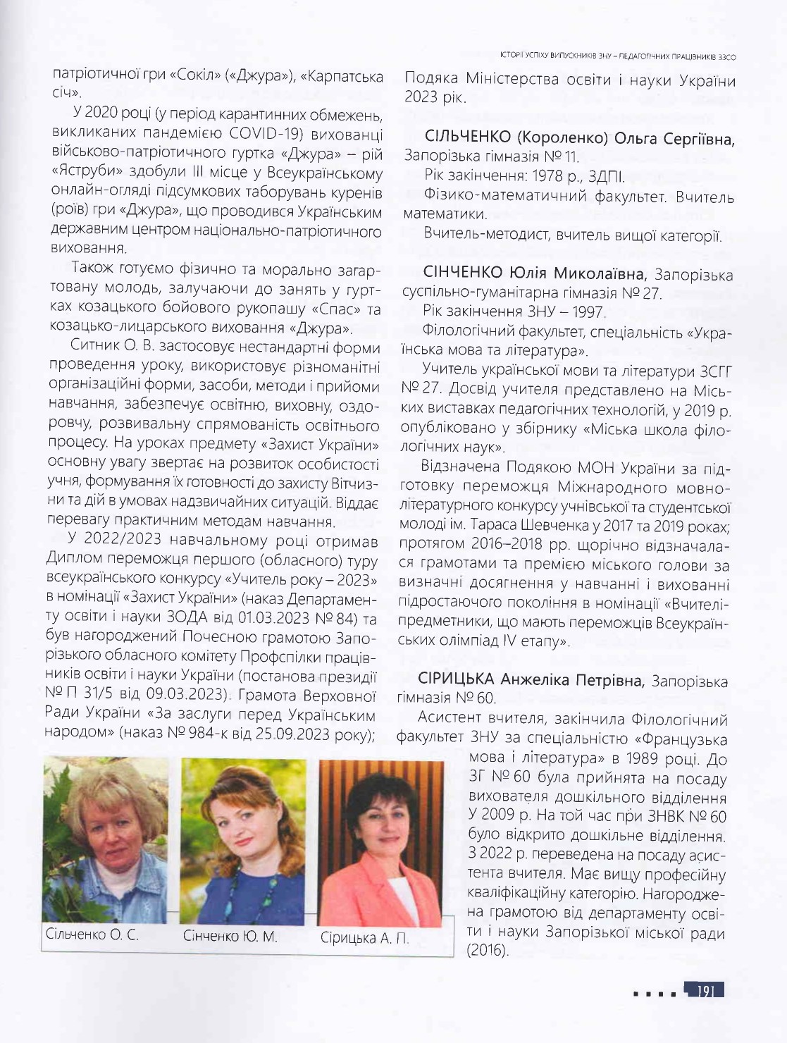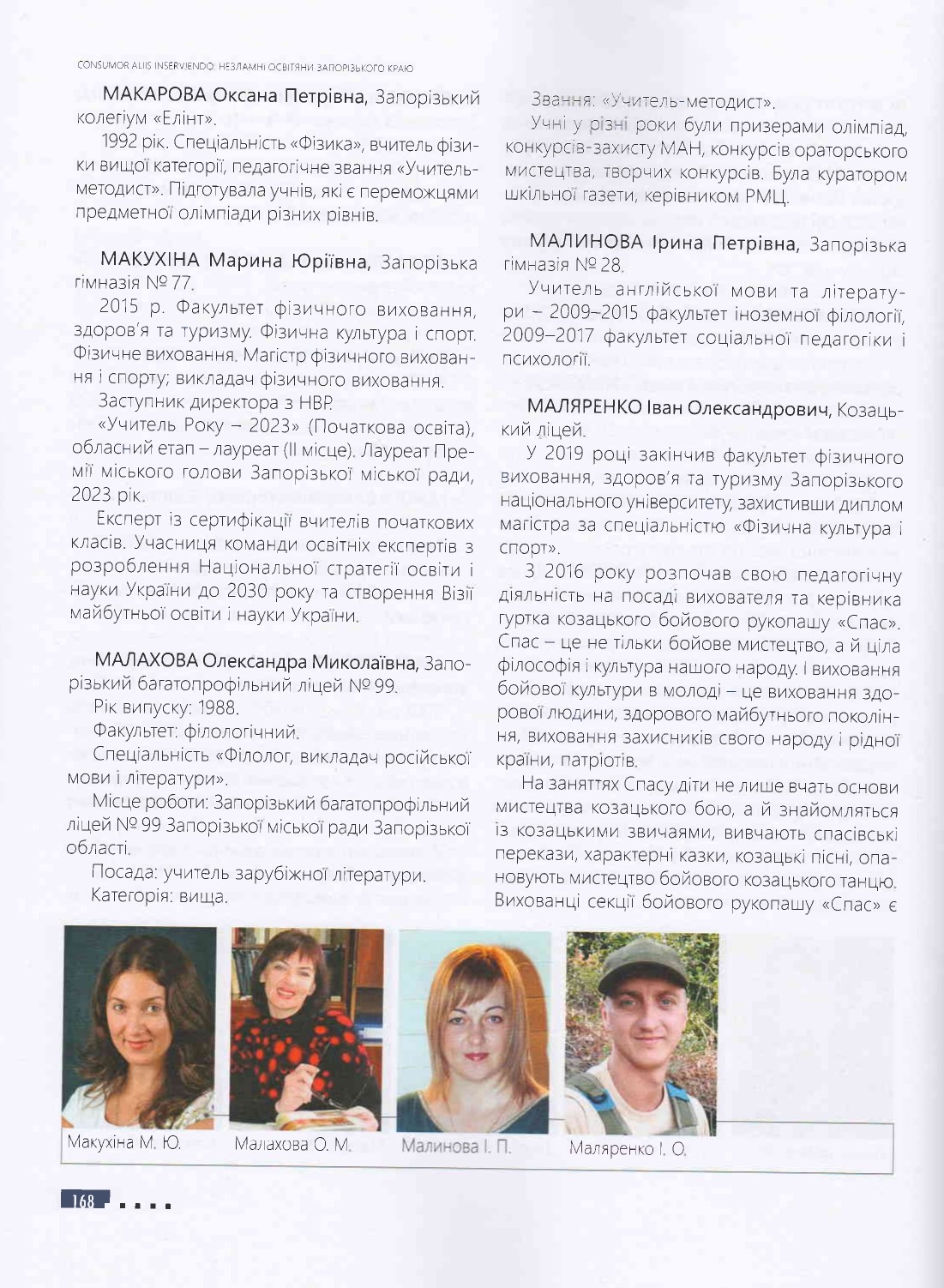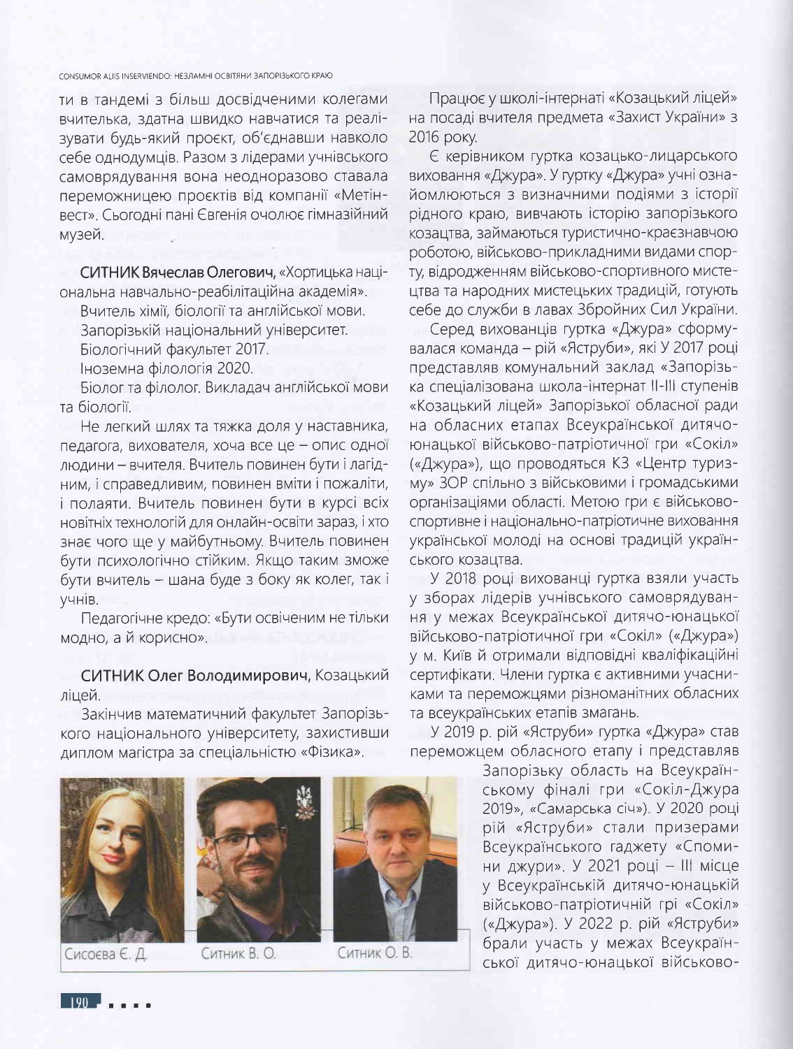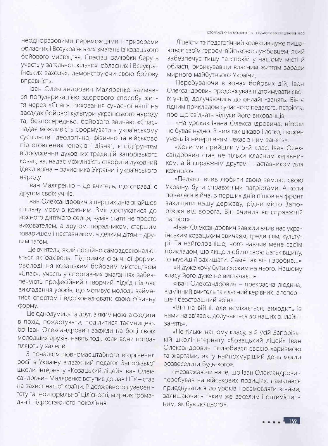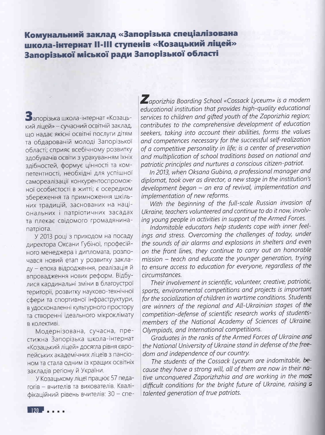 У цьому іміджево-презентаційному виданні розміщена інформація про Козацький ліцей та про випускників ЗНУ — педагогічних працівників закладу освіти, про найвагоміші досягнення незламних освітян, їхнє професійне становлення та здобутки у роки російсько-української війни – хороброго воїна-захисника рідної землі та педагога-патріота Івана Олександровича Маляренка й учителя фізики та предмета "Захист України", керівника гуртка "Джура" Олега Володимировича Ситника.