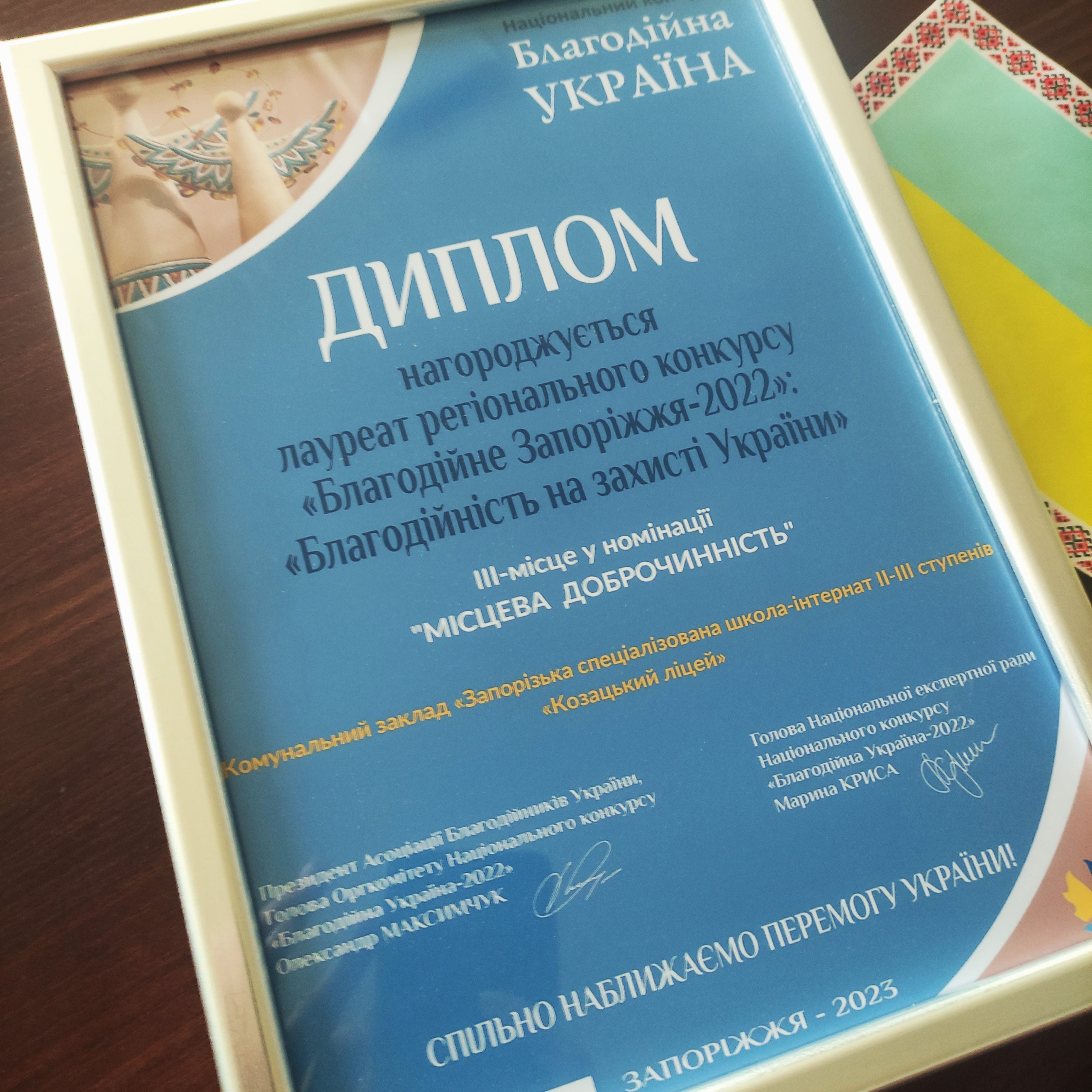 Лауреатами у номінації «МІСЦЕВА ДОБРОЧИННІСТЬ» стала Запорізька школа-інтернат «КОЗАЦЬКИЙ ЛІЦЕЙ» та здобула почесне ІІІ місце в конкурсі.