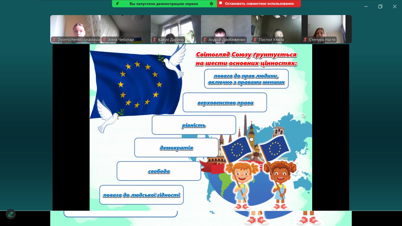Педагоги у своїх бесідах з учнями акцентували увагу на тому, що День Європи є символом прагнення до миру, співробітництва та культурного розмаїття на континенті. Вони розповідали про історичні передумови виникнення цього свята, зокрема про Декларацію Шумана, яка заклала фундамент для європейської інтеграції. Здобувачі освіти дізналися про ключові принципи, що об’єднують європейські народи: демократію, повагу до прав людини, верховенство права та прагнення до соціальної справедливості.