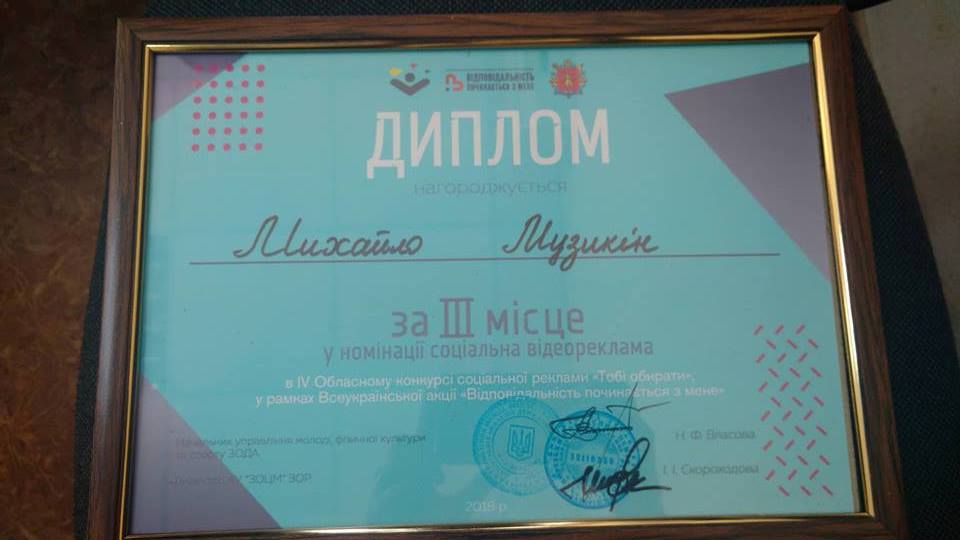 10 жовтня 2018 року у Запорізькому центрі молоді відбулося урочисте нагородження переможців IV обласного конкурсу соціальної реклами «Тобі обирати», який проводився за підтримки Управління молоді, фізичної культури та спорту обласної державної адміністрації.