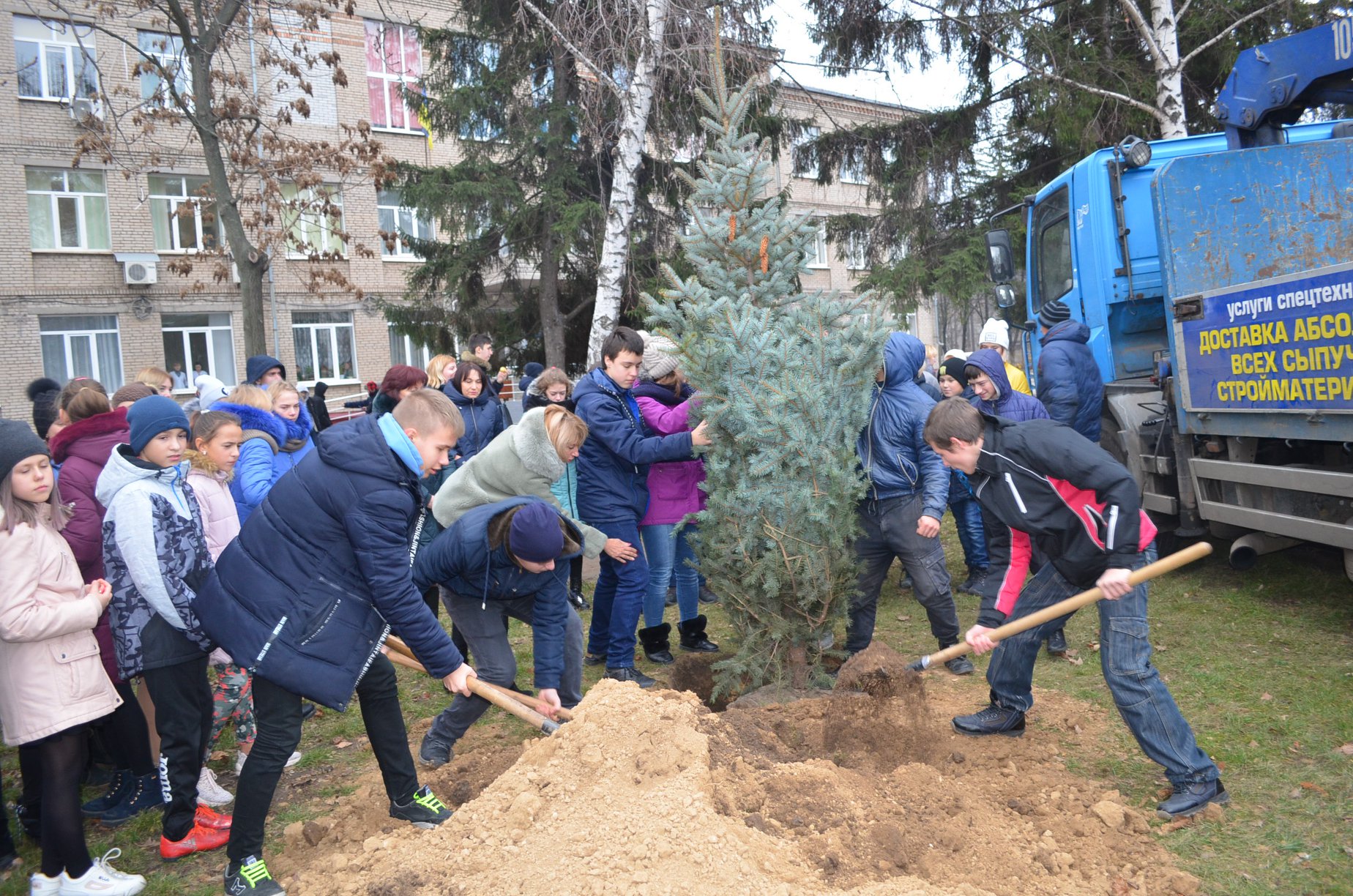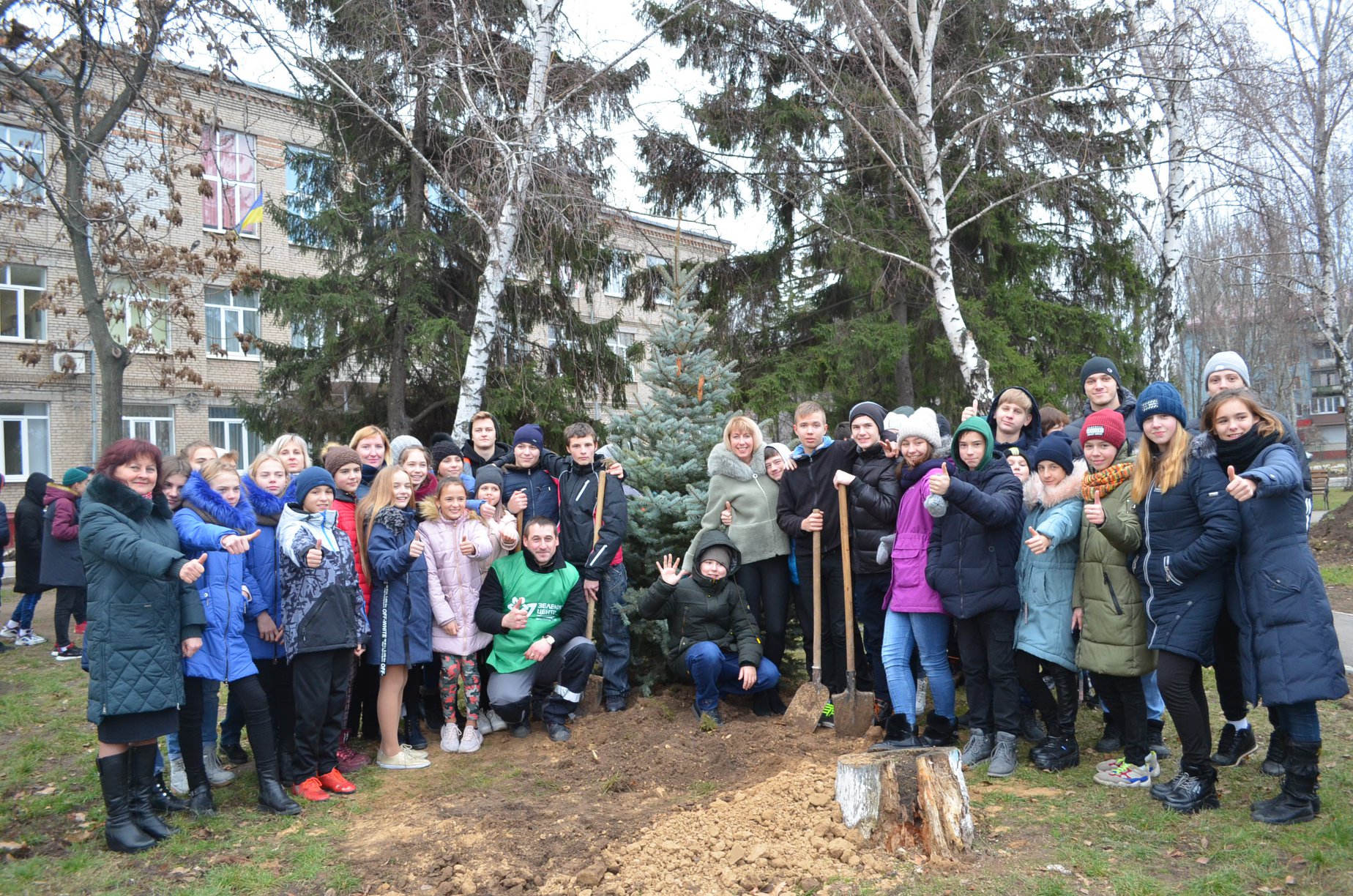 На подвір’ї освітнього закладу зібралися ліцеїсти для висадки дерева. Після завершення роботи подякували за чудовий презент.