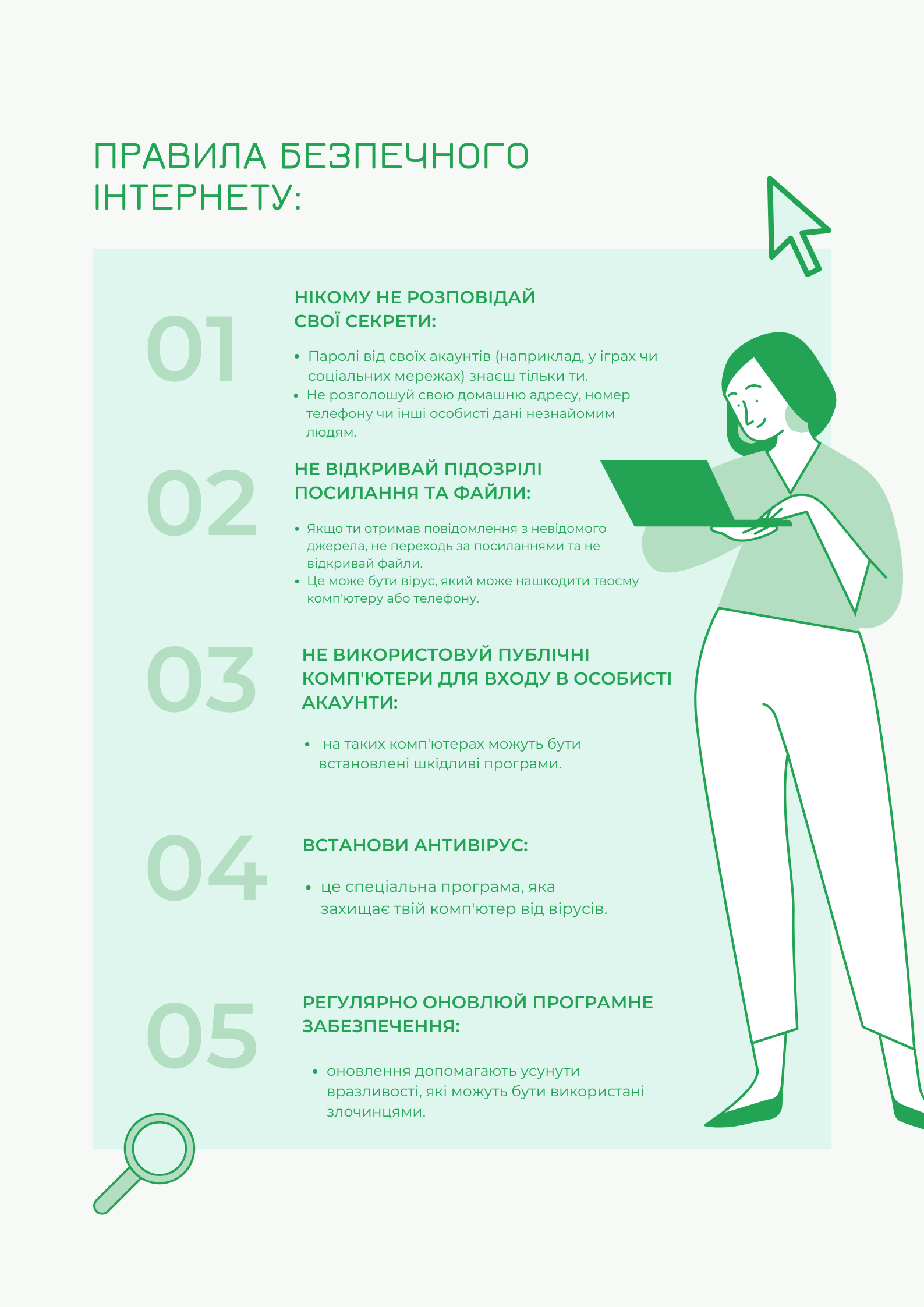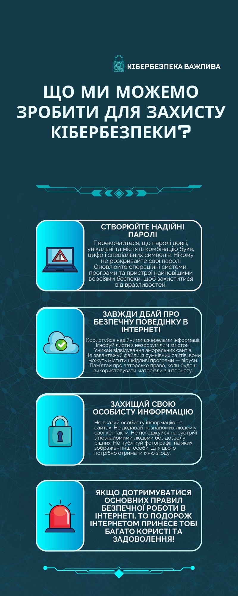Вчитель інформатики Сурган Вероніка Сергіївна провела інтерактивний урок для учнів 11-А класу під назвою "Створи гайд із кібербезпеки". Метою заходу було навчити учнів основам захисту особистих даних та безпечної поведінки в інтернеті, що є особливо актуальним у сучасному цифровому світі.