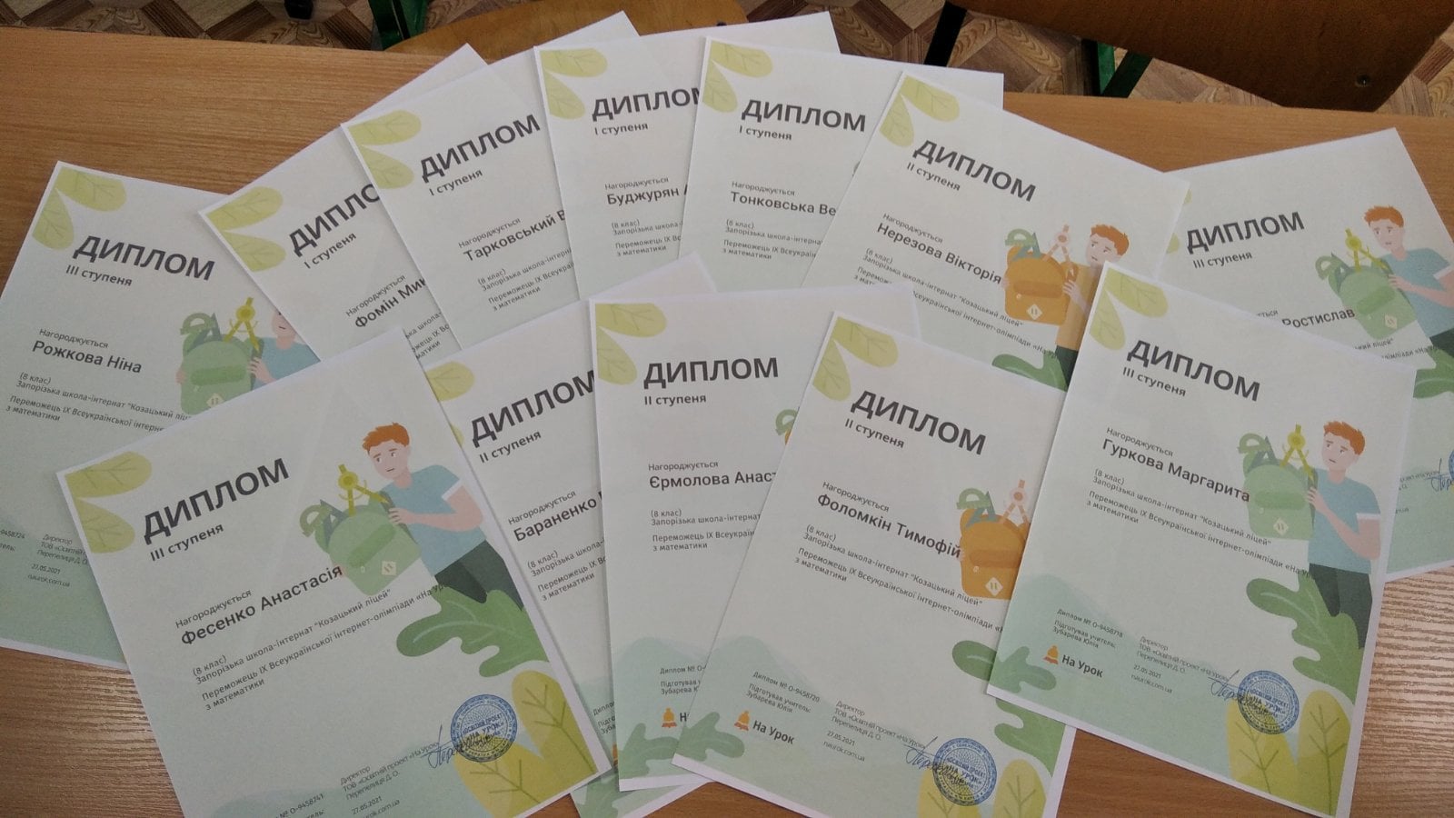 У нашій скарбничці призові місця на обласній олімпіаді з математики, Дипломи переможців I, II та III ступенів у двох олімпіадах на освітній платформі «На урок», Відмінні сертифікати у конкурсі з математики та фізики «Школа ФізТеХу 2021». Залишилося підбити підсумки двох заходів, результати яких стали відомі в останні дні травня.
