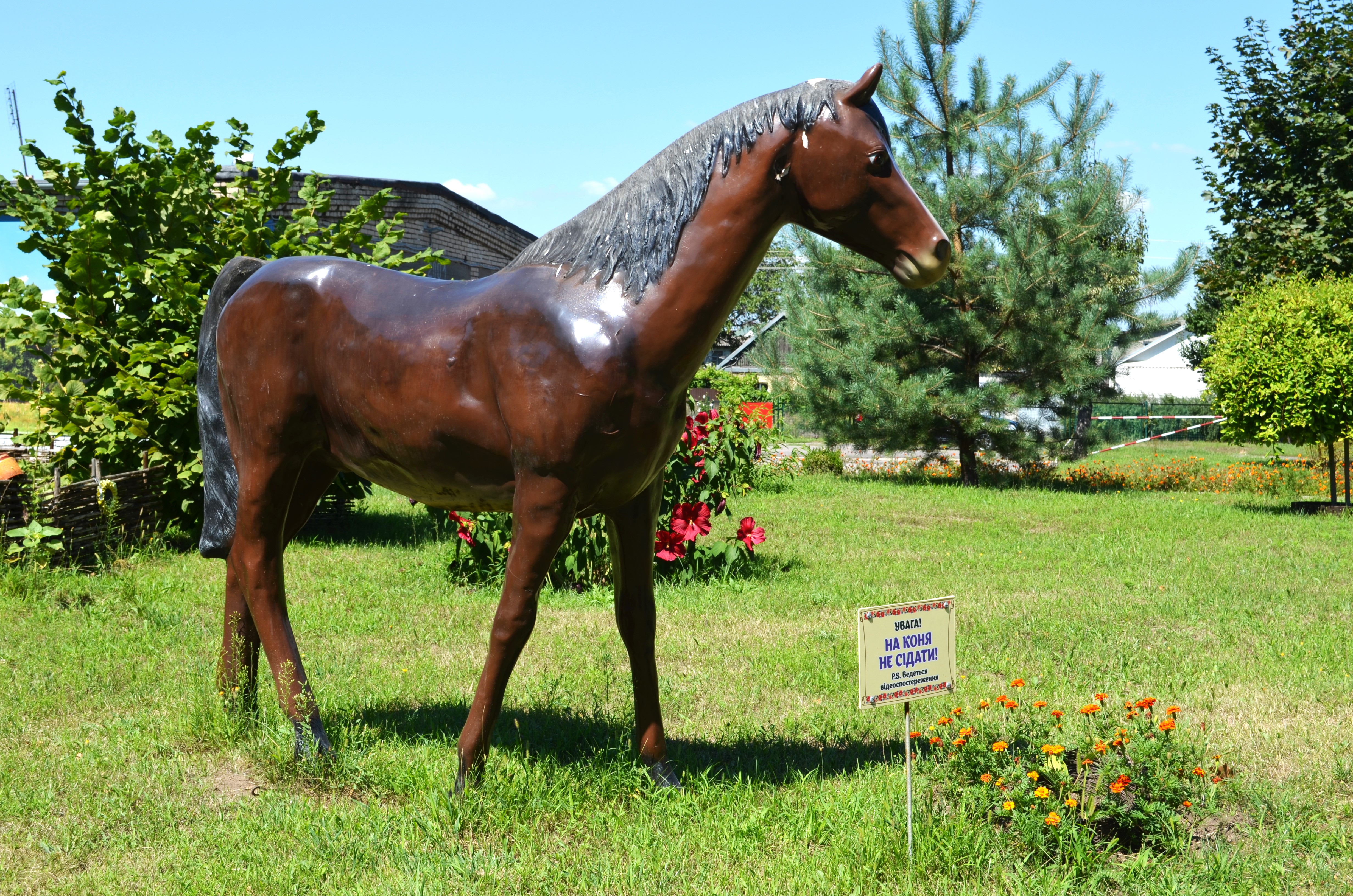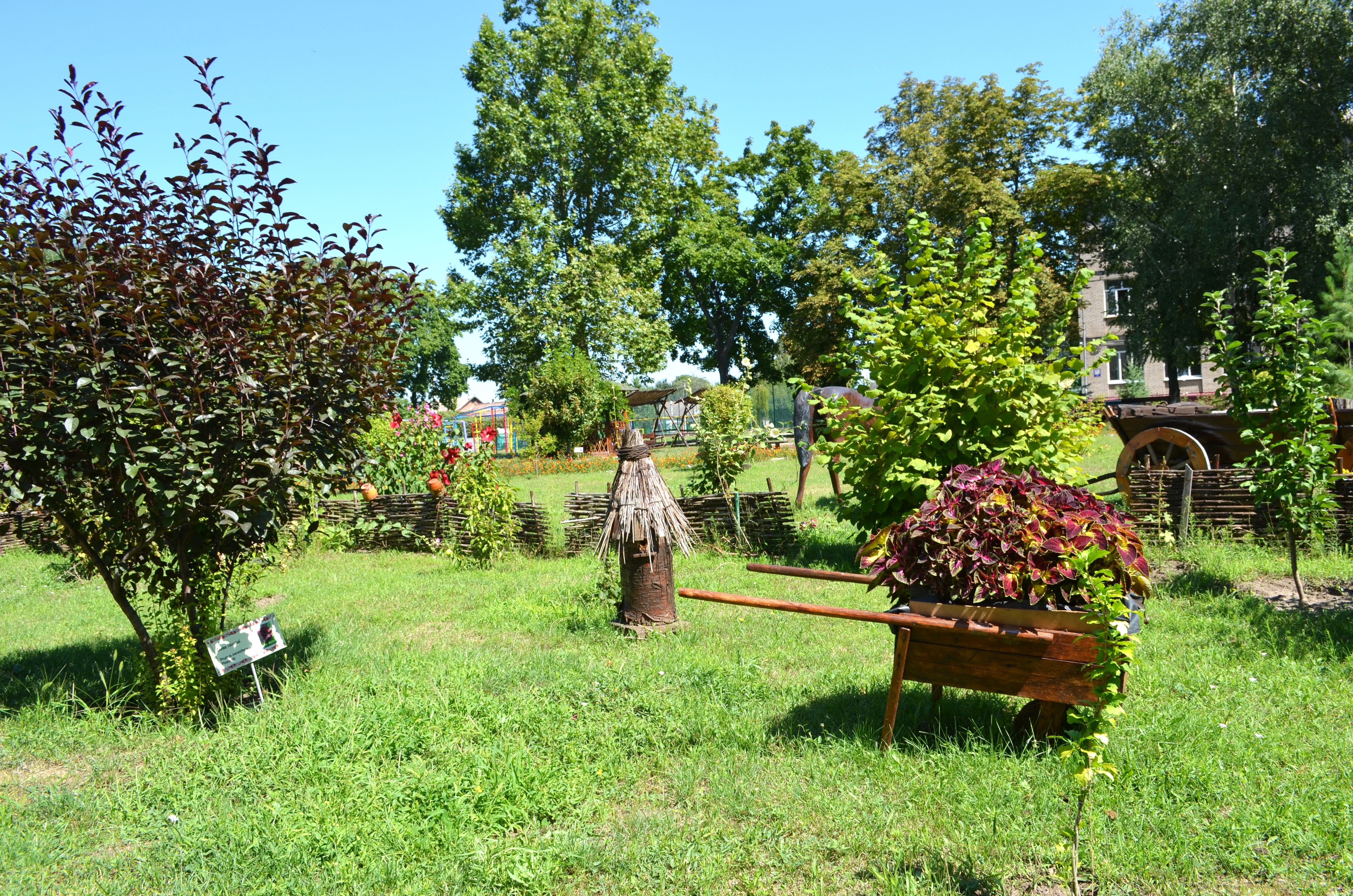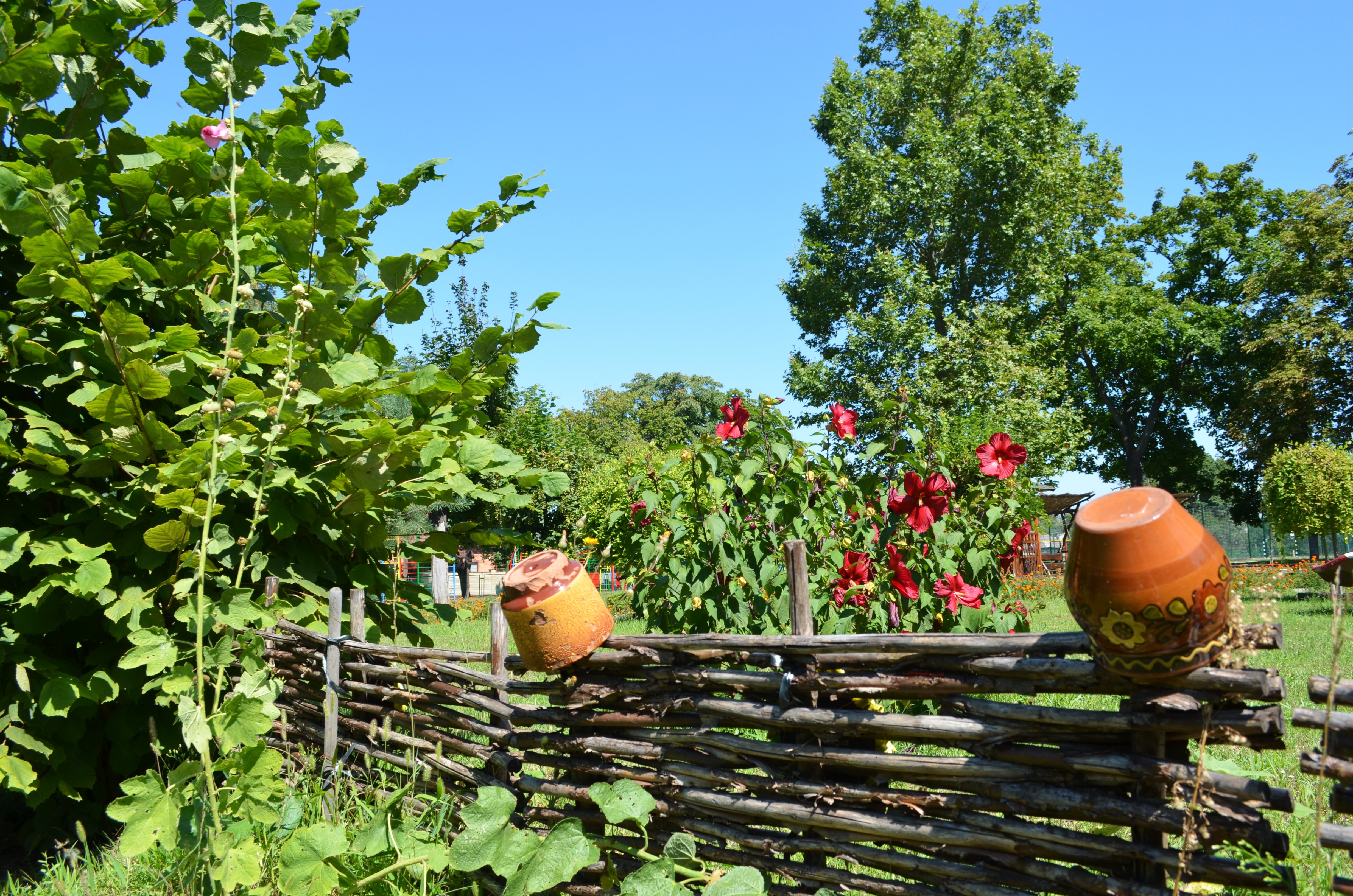 А ось і мальви біля тину та їхні пишно квітучі барвисті родичі – кущі гібіскусу. Росте тут і схожий на квітку сонця соняшничок садовий – геліопсис.