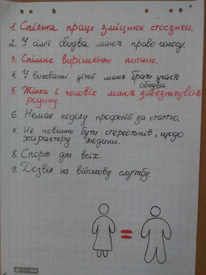 Об’єднавшись у змішані команди, хлопці та дівчата отримали можливість поспілкуватись, побудувати діалог, визначити необхідні критерії побудови стосунків у родині на засадах гендерної рівності.