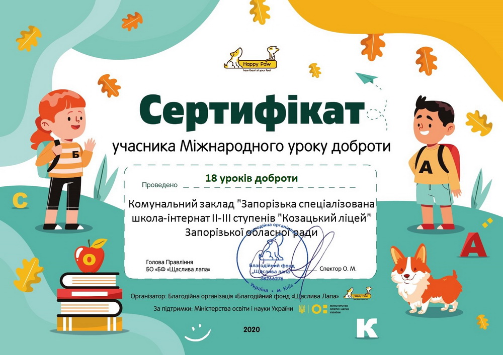 5-6 жовтня 2020 року учні та вихователі Запорізької школи-інтернату «Козацький ліцей» взяли активну участь у ІІІ Всеукраїнському уроці доброти про гуманне та відповідальне ставлення до тварин, який цього року набув статусу Міжнародного.