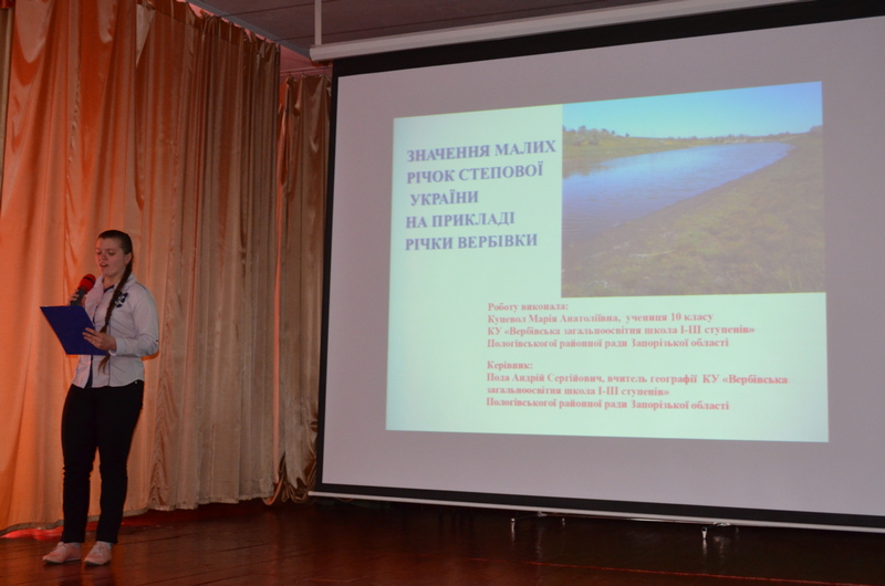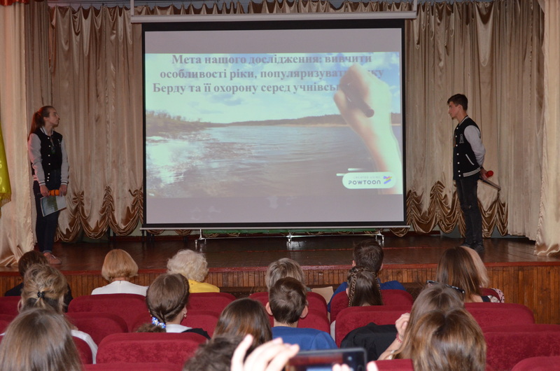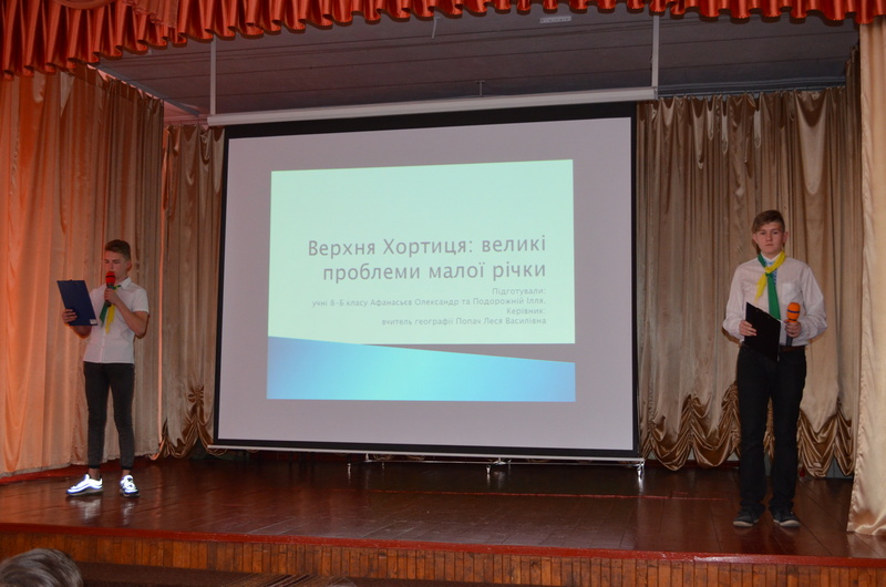 Команди освітніх закладів Запорізького краю презентували власний досвід за темою «Малі річки області». Представили свою роботу над проектом «Верхня Хортиця: великі проблеми малої річки» Афанасьєв Олександр та Подорожній Ілля, учні 8-Б класу «Козацького ліцею» (керівниця - вчитель географії Попач Леся Василівна).
