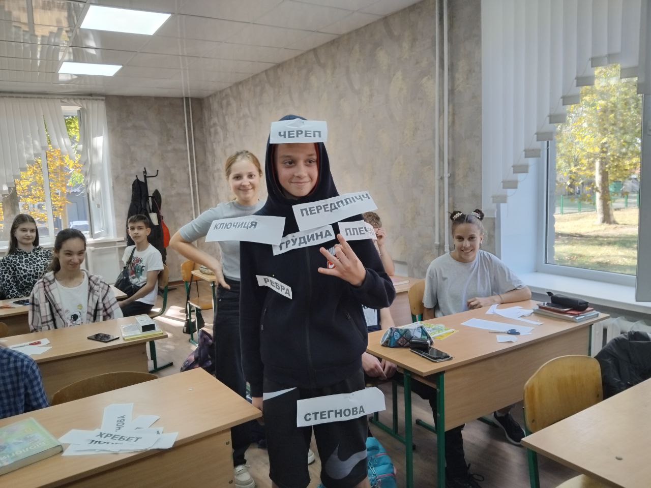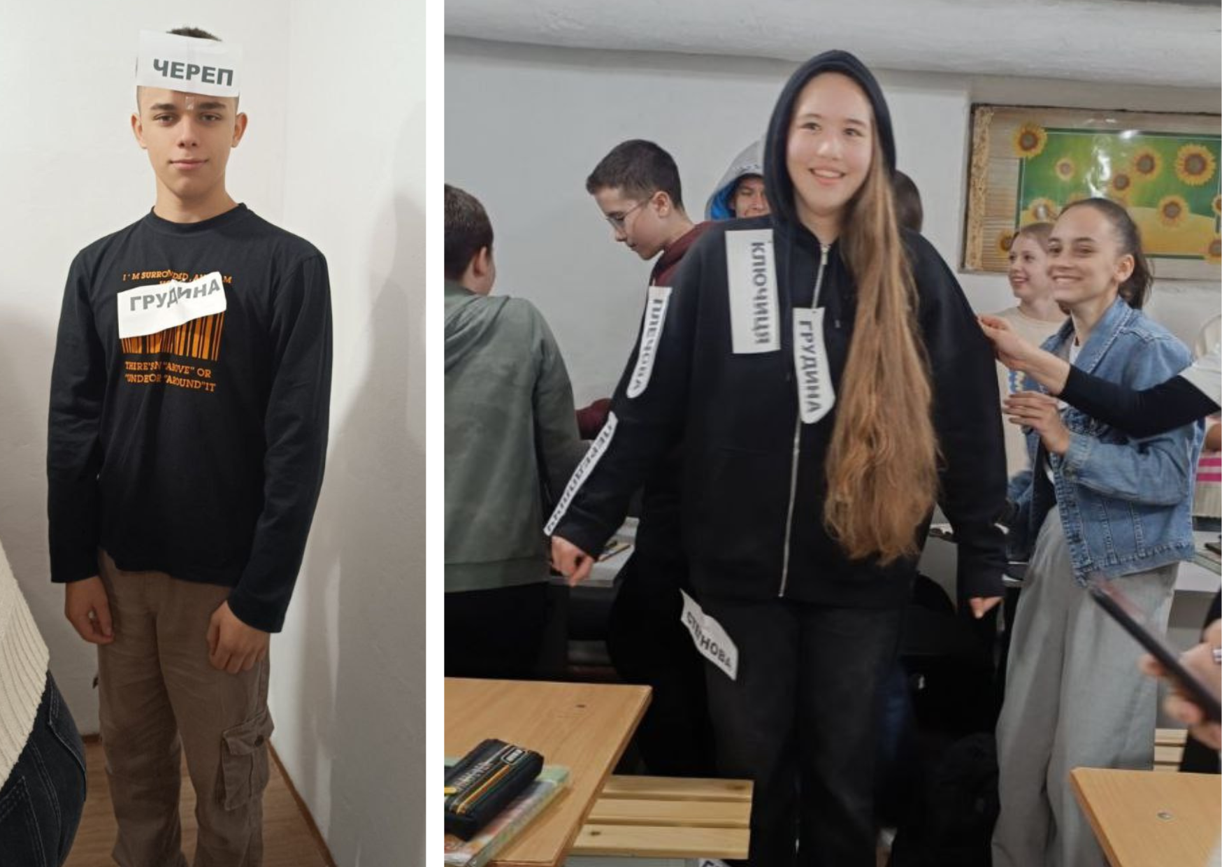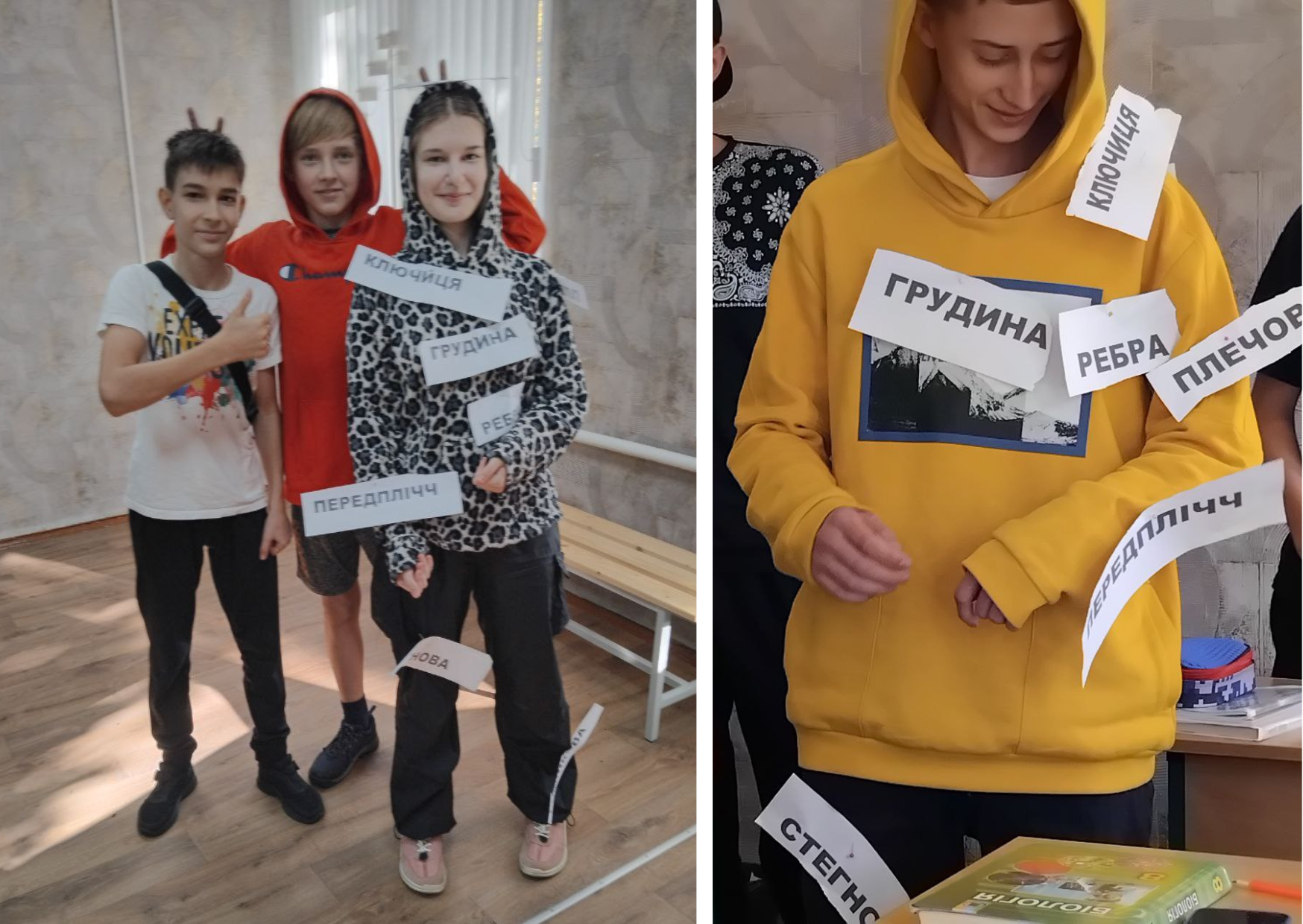 Дітям було запропоновано вправу «Знайди місце кістки». Це завдання виконували швидко, весело та вправно, кріплячи аркуші з назвами там, де розміщена та чи інша кістка на «живих манекенах» – своїх однокласниках.