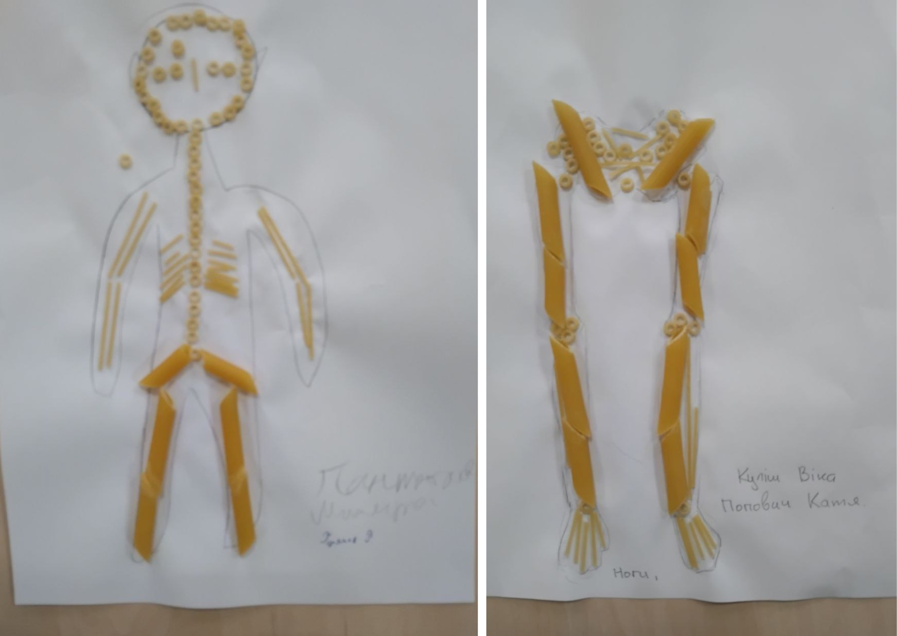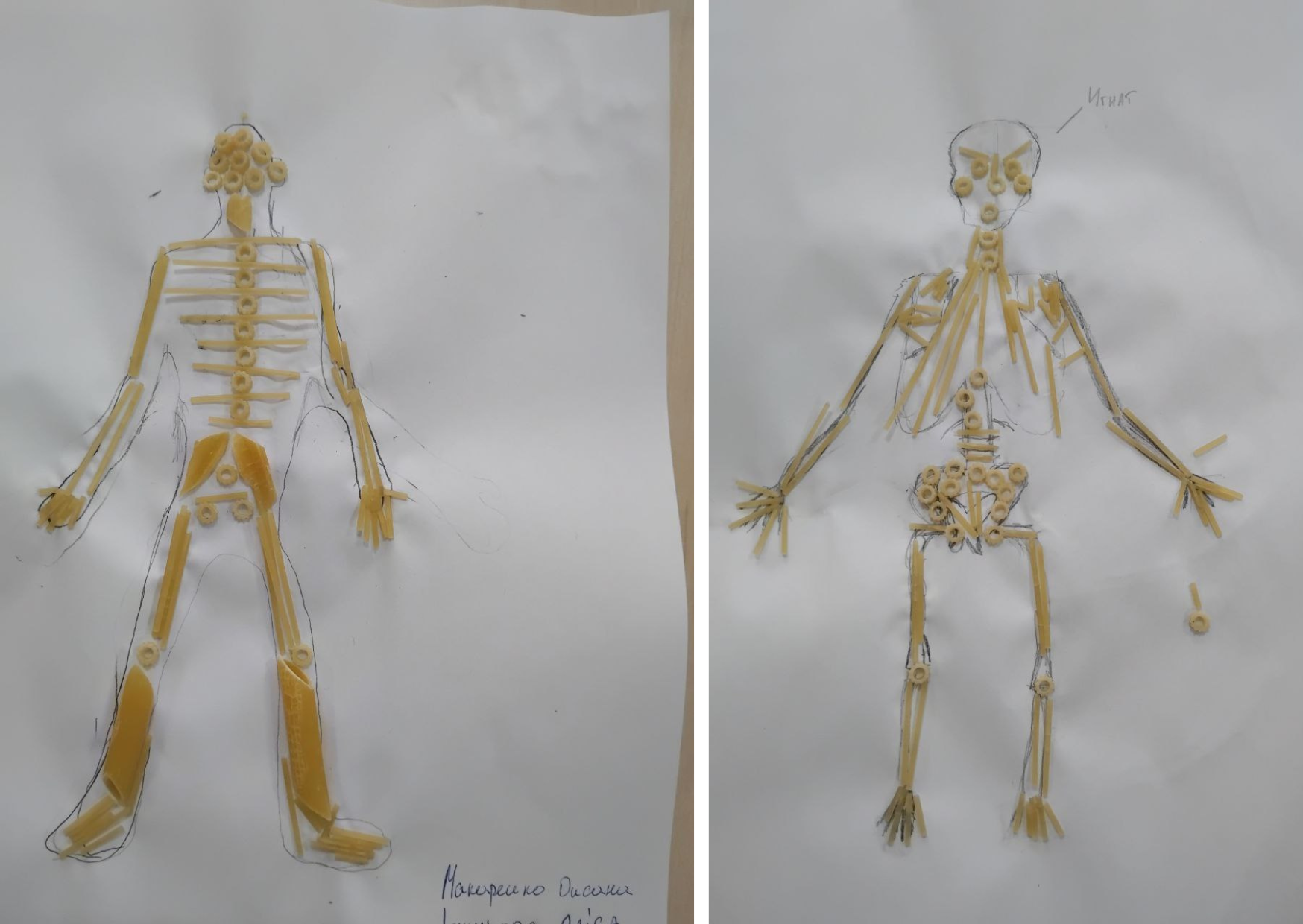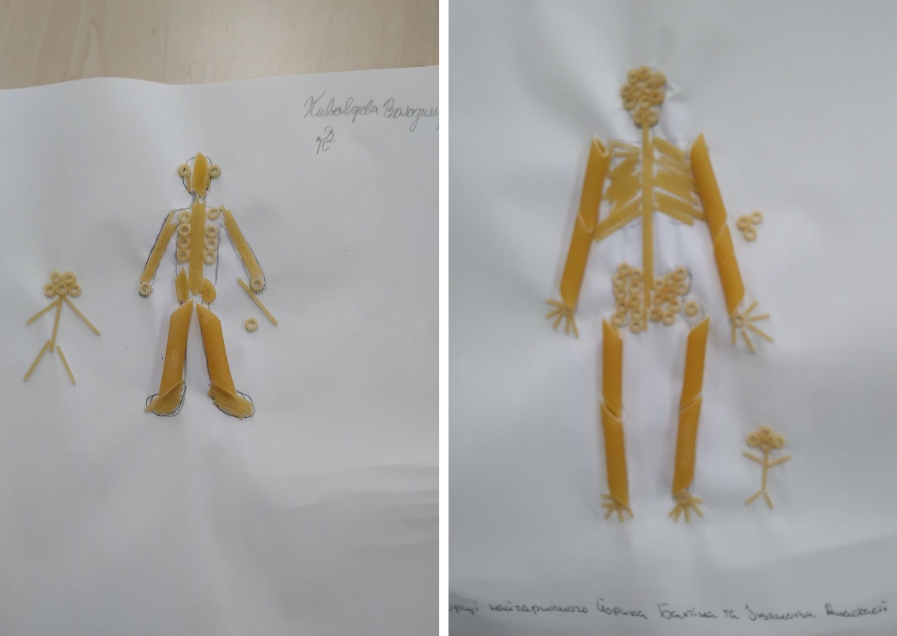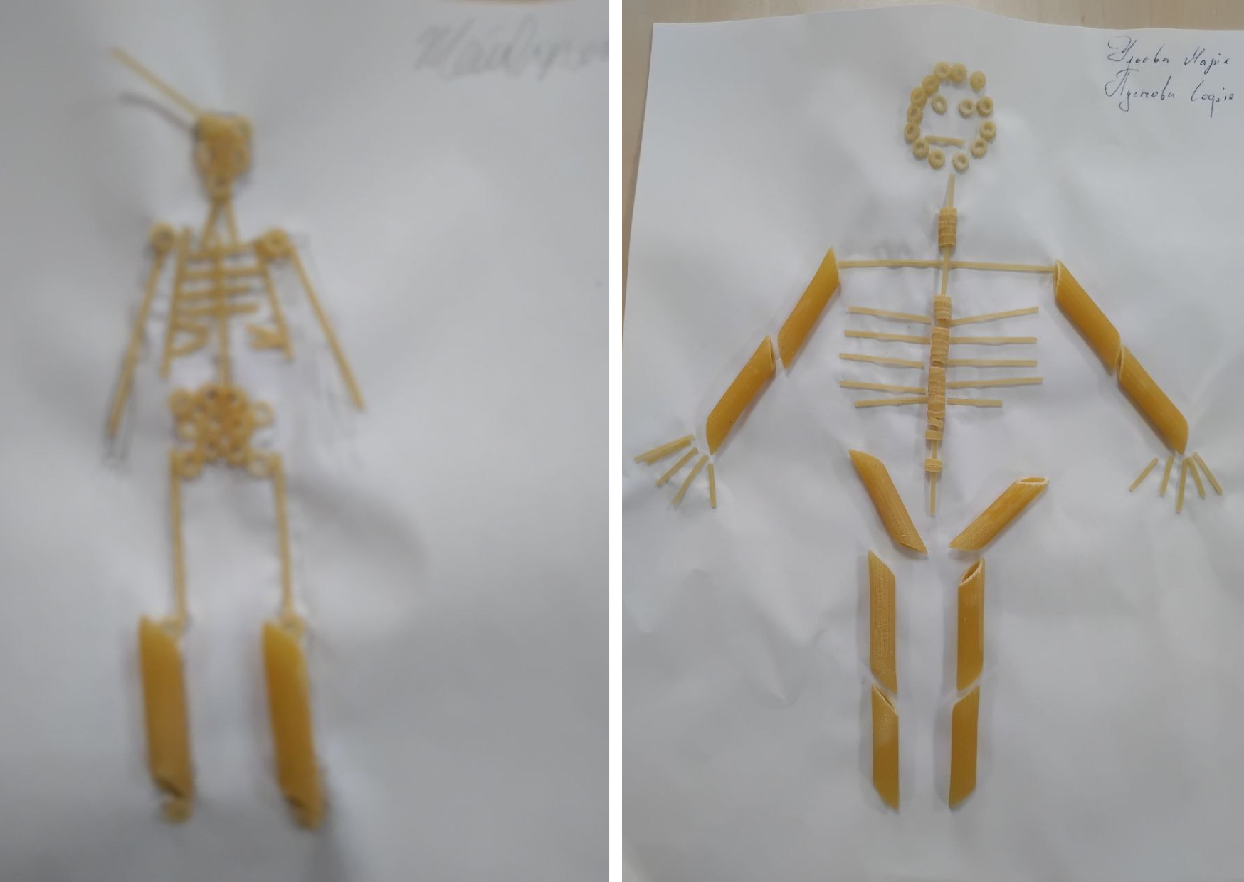 Наступне завдання – розробляли модель скелету людини із запропонованого матеріалу. Ним стали макарони. Наскільки висока віртуозність і багата фантазія у обдарованих ліцеїстів зможете оцінити, переглянувши світлини.