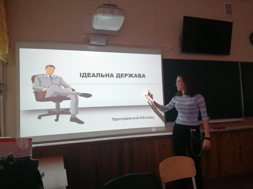 Особливо цікавим було домашнє завдання – проєкт «Якою я бачу ідеальну державу». Юнаки та дівчата з гордістю презентували свої роботи, покроково вказуючи шляхи досягнення мети.