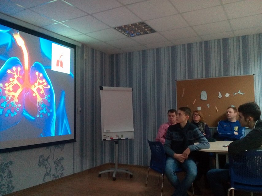 Наші спортсмени показали свої знання, які стосуються будови дихальних шляхів людини та їх функціональної значущості для організму. Диспут з юнаками допоміг зрозуміти психологічні причини, з яких починають палити підлітки та продовжують палити дорослі.