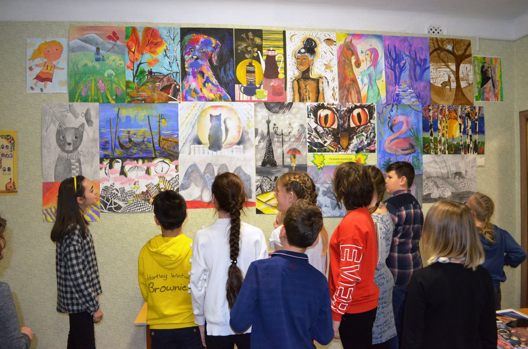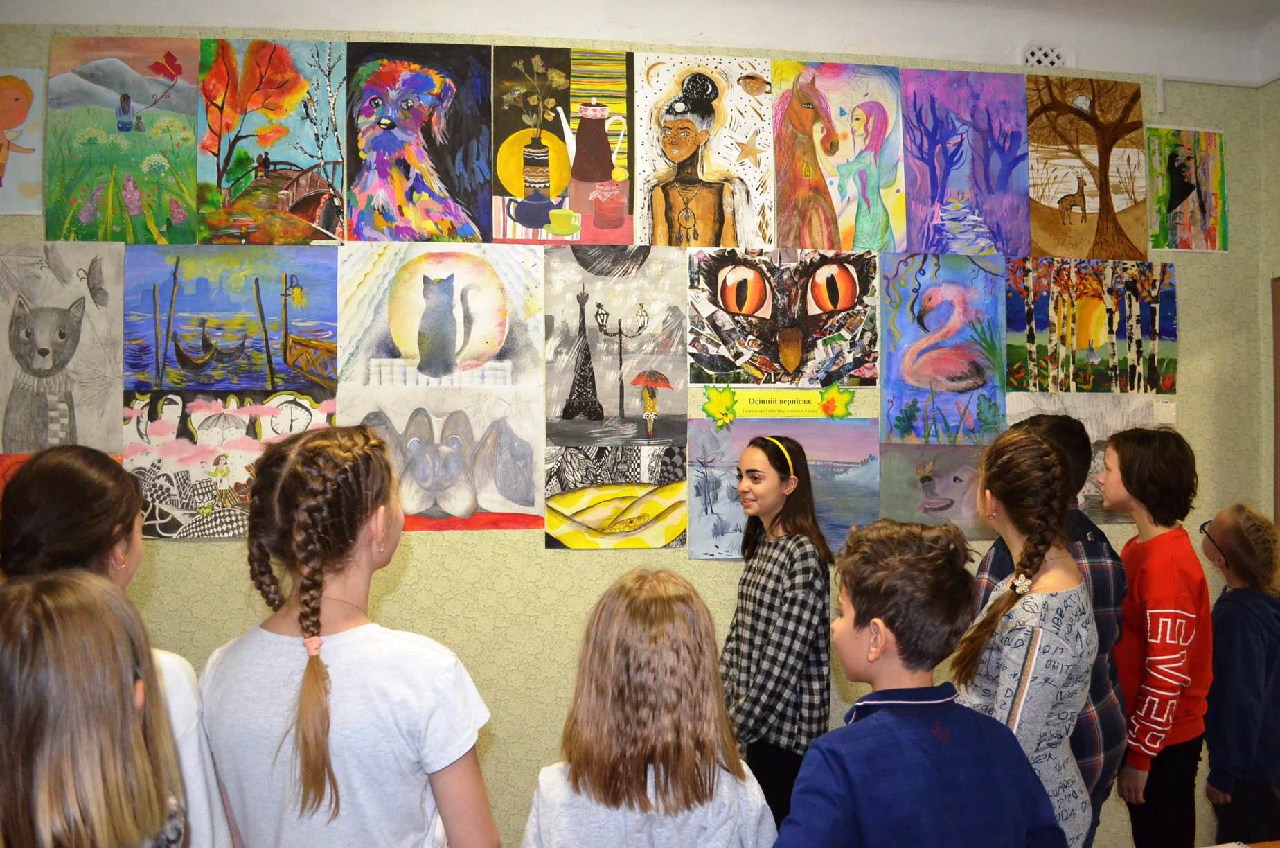 «Свої фантазії я переношу на папір, тому багато моїх робіт далекі від реальності й не схожі на наш світ», - розповідає художниця учням 5-Б класу, які завітали на виставку картин.