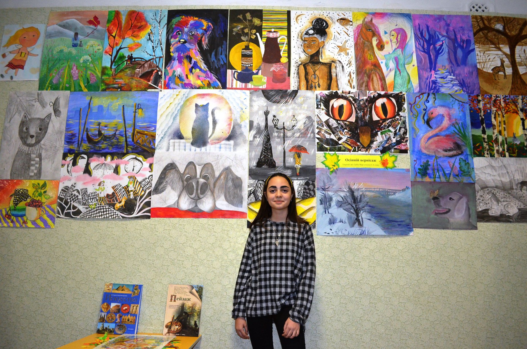 От вже місяць у бібліотеці Запорізької школи-інтернату «Козацький ліцей» проходить дебютна виставка картин юної художниці Габбе Марі.