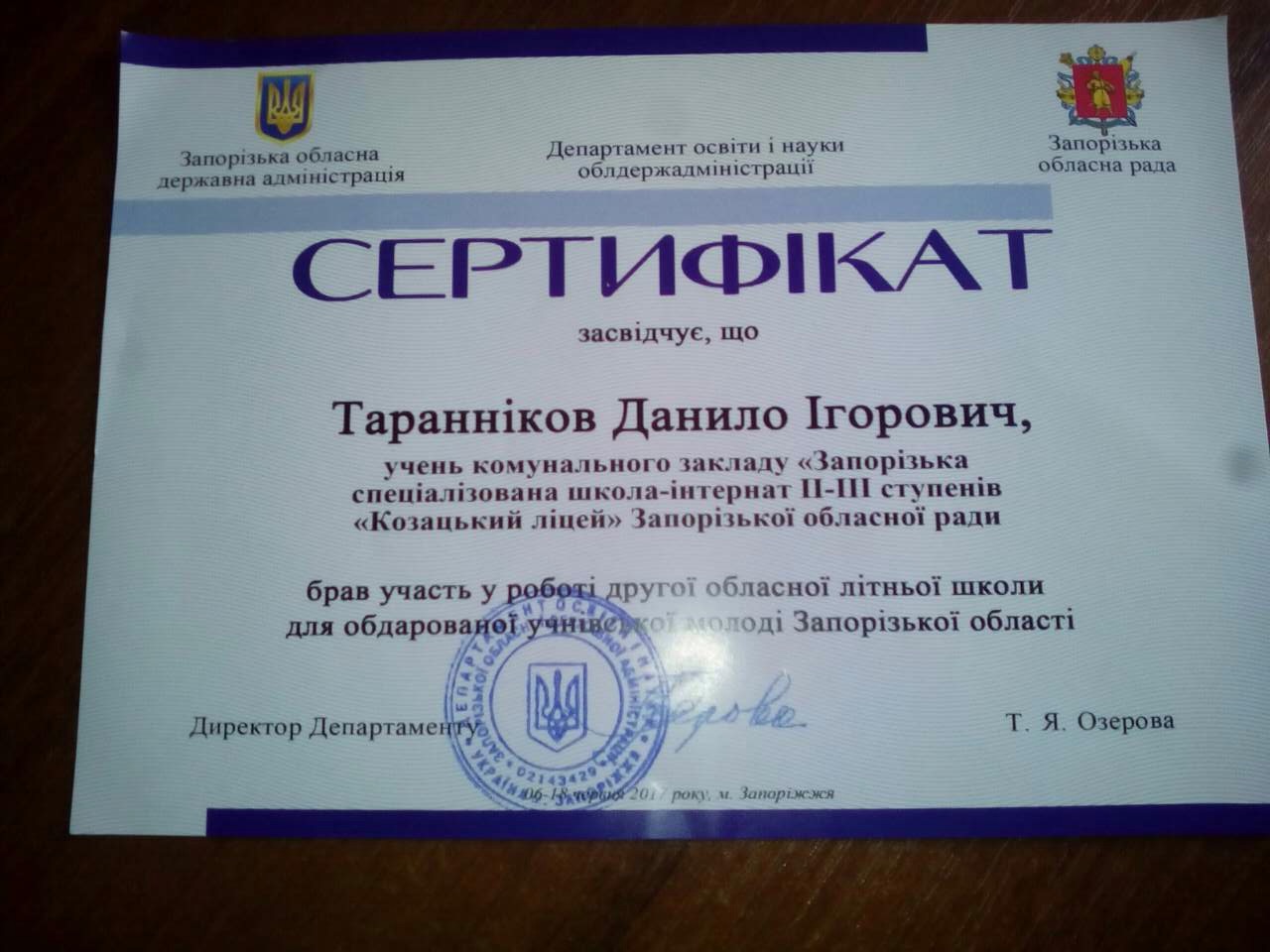 З 6 по 18 червня 2017 року учні 8-В класу комунального закладу «Запорізька спеціалізована школа-інтернат ІІ-ІІІ ступенів «Козацький ліцей» Запорізької обласної ради Таранніков Данило, Акопян Гарегін та Сещенко Іван брали участь у роботі Другої обласної літньої школи для обдарованої учнівської молоді Запорізької області.