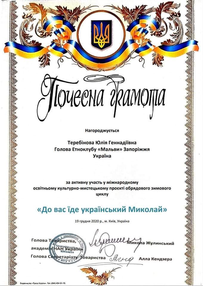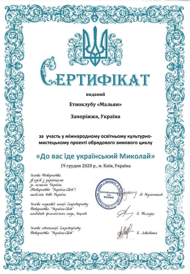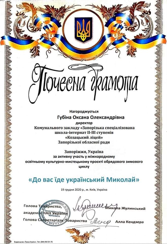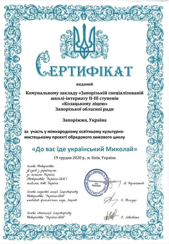 Напередодні Дня Святого Миколая учні, батьки і педагоги Запорізької школи-інтернату «Козацький ліцей» спільно з етноклубом «Мальви» міста Запоріжжя долучилися до Міжнародної культурологічно-мистецької акції «До вас їде український Миколай», яка цього року відбулася дистанційно у прямому етері з Національного музею літератури України.