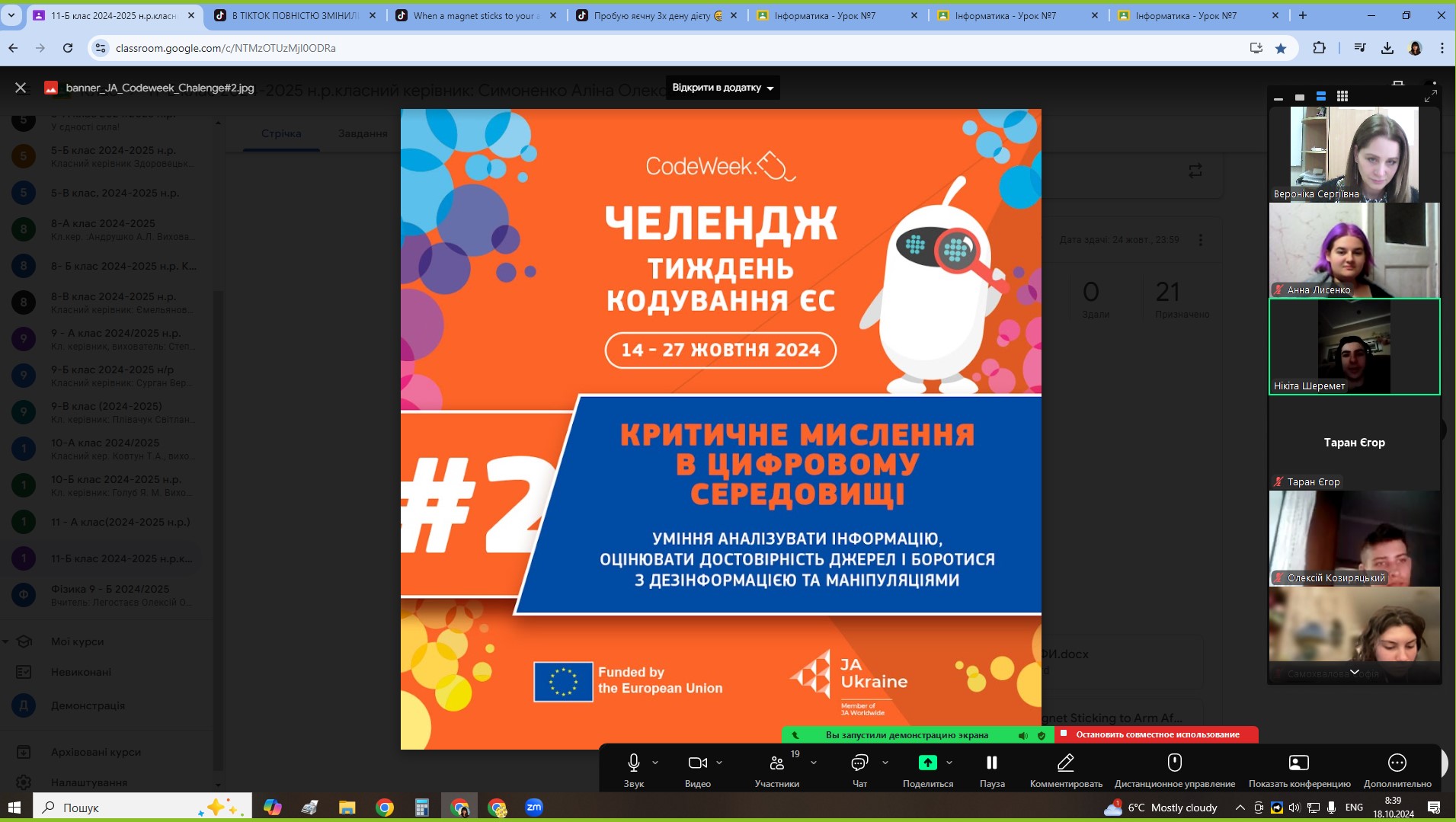 18 жовтня 2024 року у межах челенджу «Тиждень Кодування ЄС», організованого Junior Achievement Ukraine учні 11-Б класу Запорізької спеціалізованої школи-інтернату «Козацький ліцей» взяли участь у другому завданні челенджу. Урок для старшокласників на тему «Розвінчування міфів на TikTok» провела вчителька інформатики Сурган Вероніка Сергіївна.