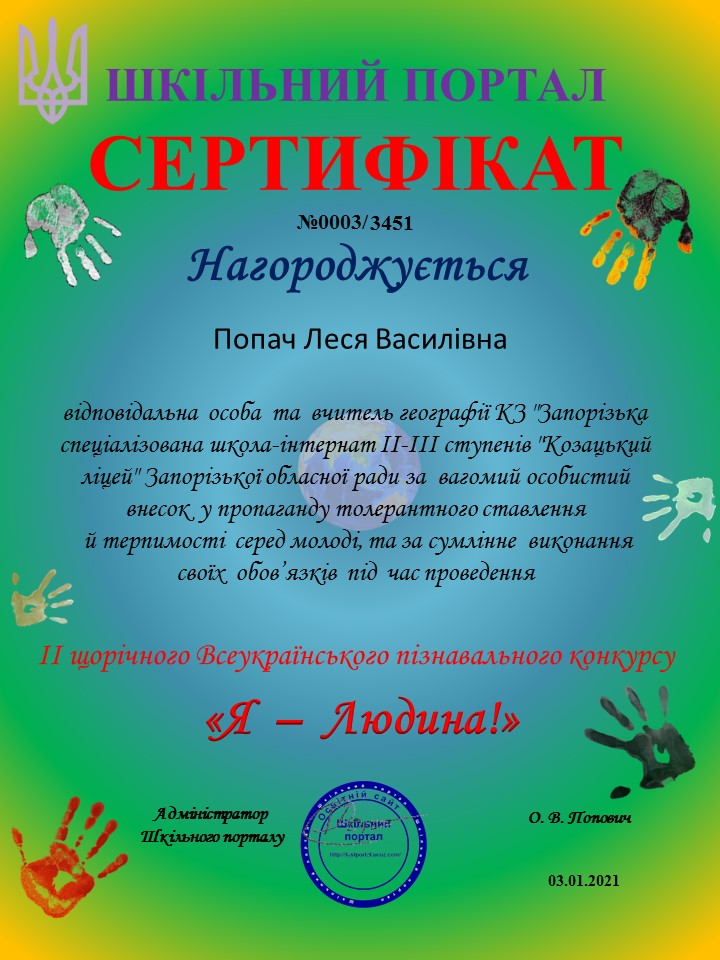 У листопаді 2020 року учні 6-А та 6-Б класів Запорізької школи-інтернату «Козацький ліцей» під керівництвом вчителя географії Попач Лесі Василівни стали учасниками ІІ Всеукраїнського пізнавального конкурсу «Я – Людина».