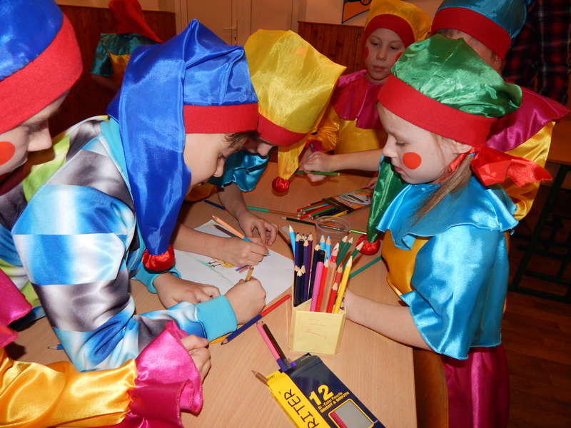Класи-команди отримали маршрутні листи і відправились подорожувати станціями: «Символ року», «Пазлова», «Веселі кульки», «Пантоміма», «Загадкова», «Закинь сніжок у кошик», «Лабіринт», «Наряди ялинку». Діти виконували різні завдання, щоб врятувати головних гостей свята, яких, за сюжетом, нібито викали розбійники.