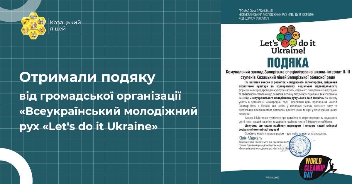ОТРИМАЛИ ПОДЯКУ ВІД ГРОМАДСЬКОЇ ОРГАНІЗАЦІЇ «ВСЕУКРАЇНСЬКИЙ МОЛОДІЖНИЙ РУХ «LET'S DO IT UKRAINE»