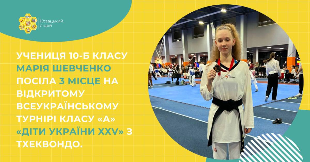 Учениця 10-Б класу Козацького ліцею Шевченко Марія виборола бронзову нагороду на Всеукраїнських змаганнях з тхеквондо ВТФ.
