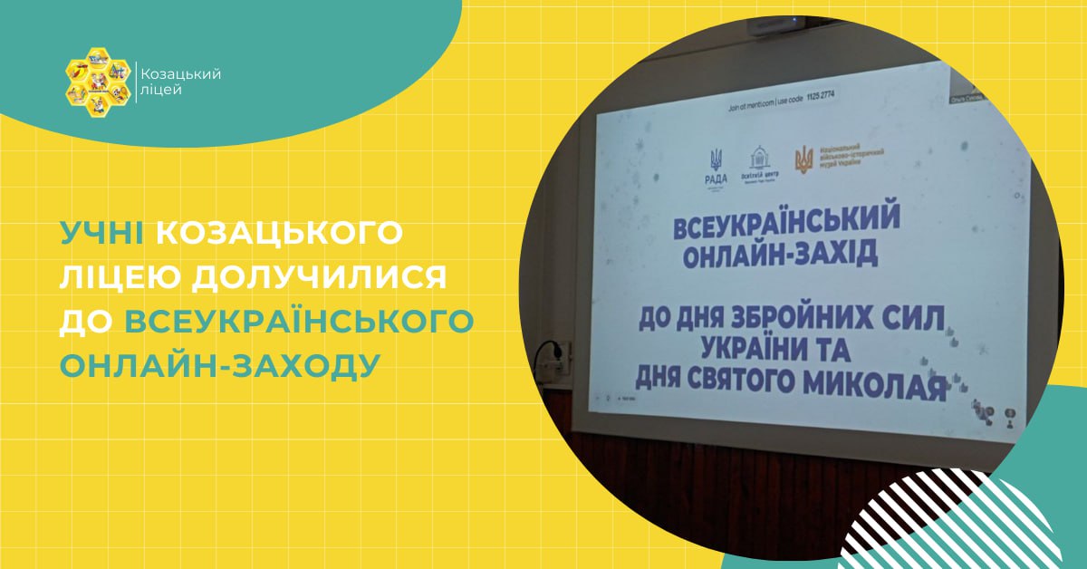 5 грудня учні Козацького ліцею взяли участь у всеукраїнському онлайн-заході, організованому Освітній центр Верховної Ради України у співпраці з Національний військово-історичний музей України. Подія була присвячена Дню Святого Миколая та Дню Збройних Сил України.
