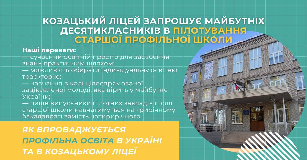 У Козацькому ліцеї здійснюється набір учнів до 10-х класів на 2026–2027 навчальний рік за такими профілями навчання: