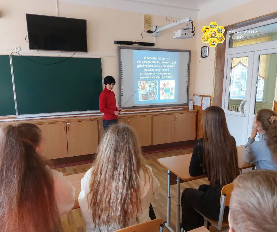 З нагоди Дня толерантності в Козацькому ліцеї проведено виховну годину «Світ толерантності». Учні ознайомилися з принципами толерантної поведінки, важливістю взаємоповаги та прийняття думок і переконань інших людей.