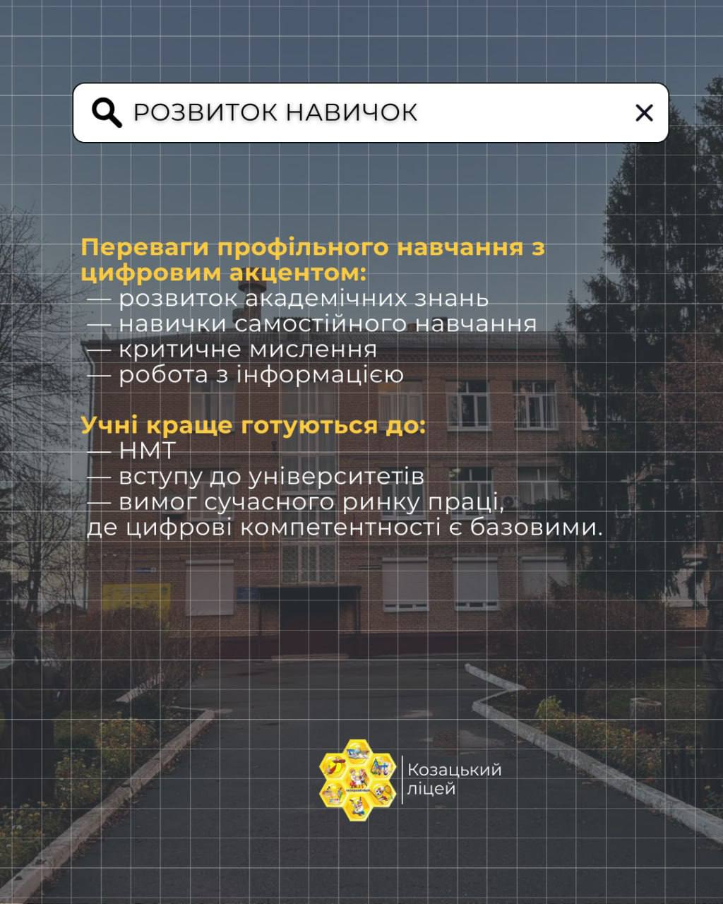 У Козацькому ліцеї профільне навчання поєднується із сучасними педагогічними підходами та використанням цифрових освітніх інструментів, що сприяє розвитку ключових компетентностей, підвищенню навчальної мотивації та кращій підготовці учнів до подальшого навчання й професійного самовизначення.