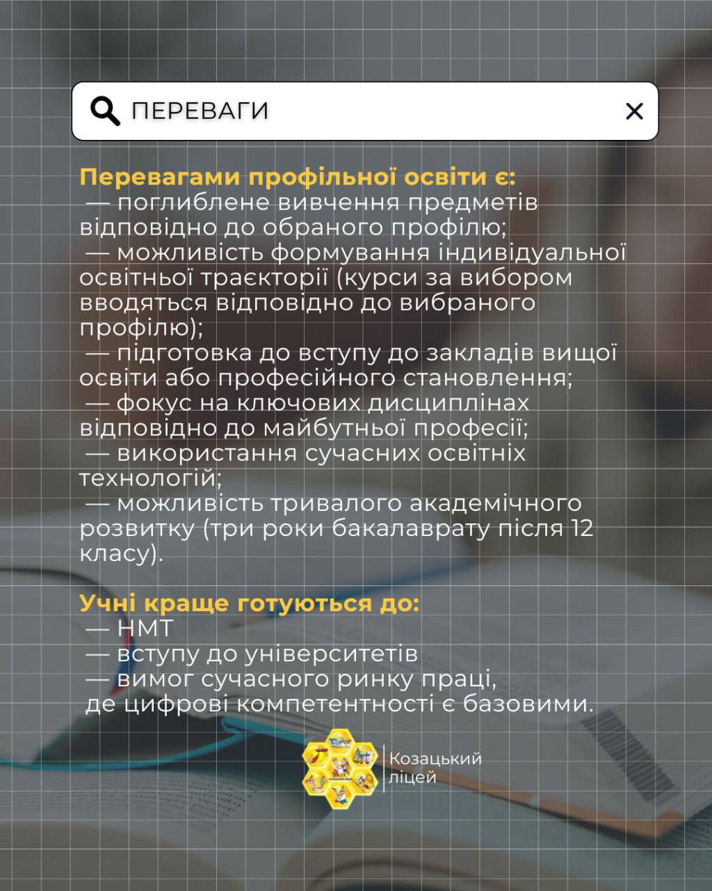 Козацький ліцей запрошує учнів до 10-х класів на 2026–2027 навчальний рік за такими профілями: