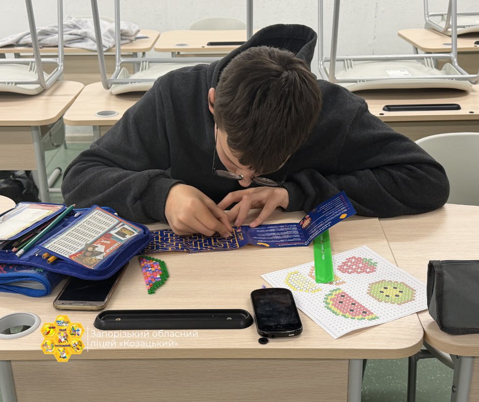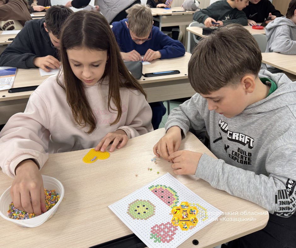 Під час практичної роботи школярі створювали власні композиції з кольорових намистин, розвиваючи дрібну моторику, просторове мислення, уважність та творчі здібності.